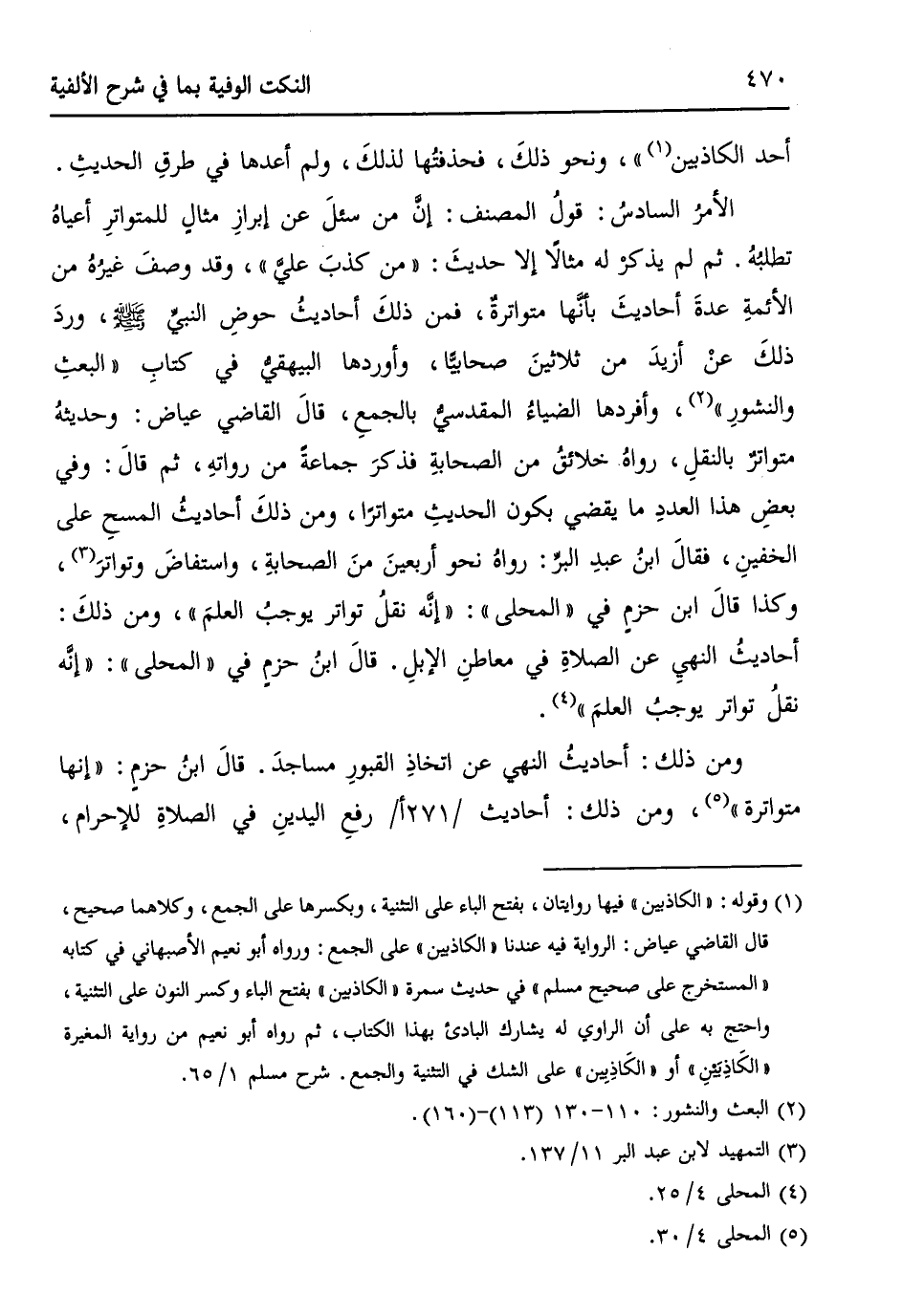 ومن ذلك: أحاديثُ النهي عن اتخاذِ القبورِ مساجدَ. قالَ ابنُ حزمٍ: ((إنها متواترة)) (¬5)، ومن ذلك: أحاديث / 271 أ / رفعِ اليدينِ في الصلاةِ للإحرام،