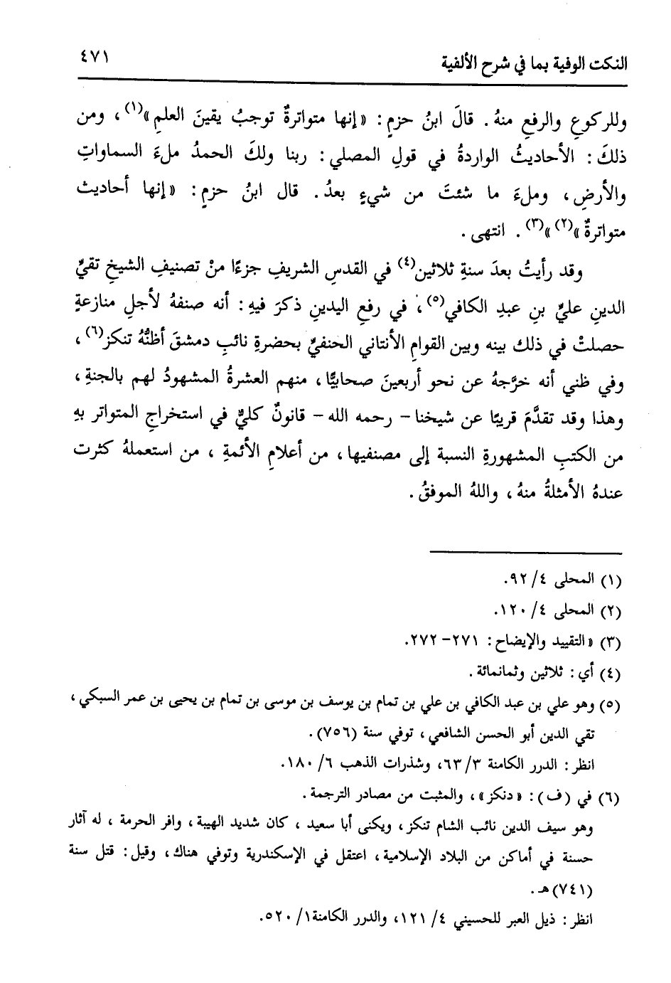 وقد رأيتُ بعدَ سنةِ ثلاثين (¬4) في القدسِ الشريفِ جزءاً منْ تصنيفِ الشيخِ تقيِّ الدينِ عليِّ بنِ عبدِ الكافي (¬5)، في رفعِ اليدينِ ذكرَ فيهِ: أنه صنفهُ؛ لأجلِ منازعةٍ حصلتْ في ذلك بينه وبين القوامِ الانتاني الحنفيِّ بحضرةِ نائبِ دمشقَ أظنُّهُ تنكز (¬6)، وفي ظني أنه خرَّجهُ عن نحو أربعينَ صحابياً، منهمُ العشرةُ المشهودُ لهم بالجنةِ، وهذا وقد تقدَّمَ قريباً عن شيخنا - رحمه الله - قانونٌ كليٌّ في استخراجِ المتواتر بهِ من الكتبِ المشهورةِ النسبة إلى مصنفيها، من أعلامِ الأئمةِ من استعملهُ كثرت عندهُ الأمثلةُ منهُ، والله الموفقُ.