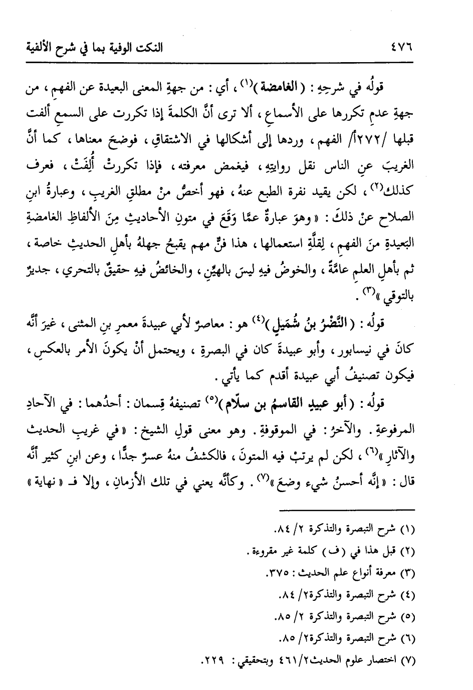 قولُهُ: (النَّضْرُ بنُ شُمَيلٍ) (¬4) هو: معاصرٌ لأبي عبيدةَ معمرُ بنُ المثنى، غيرَ أنَّه كانَ في نيسابور، وأبو عبيدةَ كان في البصرةِ ويحتمل أنْ يكونَ الأمر بالعكسِ، فيكون تصنيفُ أبي عبيدة أقدم كما يأتي.