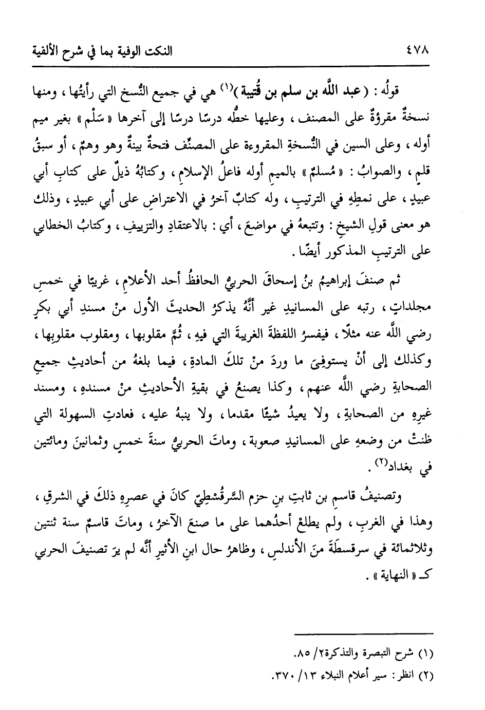 قولُهُ: (عبد الله بن سلم بن قُتيبة) (¬1) هي في جميع النُّسخ التي رأيتُها، ومنها نسخةٌ مقرؤةٌ على المصنف، وعليها خطُّه درساً درساً إلى آخرها ((سَلْم)) بغير ميم أوله، وعلى السين في النُّسخةِ المقرؤةِ على المصنِّف فتحةٌ بينةٌ وهو وهمٌ، أو سبقُ قلمٍ، والصوابُ: ((مُسلمٌ)) بالميمِ أوله فاعلُ الإسلامِ، وكتابُهُ ذيلٌ على كتابِ أبي عبيدٍ، على نمطِهِ في الترتيبِ، وله كتابٌ آخرُ في الاعتراضِ على أبي عبيدٍ، وذلك هو معنى قولِ الشيخِ، وتتبعهُ في مواضعَ، أي: بالاعتقادِ والتزييفِ، وكتابُ الخطابي على الترتيبِ المذكور أيضاً.