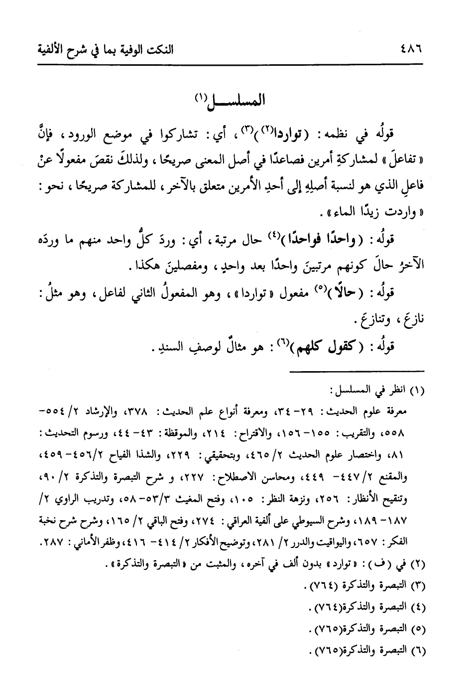 قولُهُ في نظمه: (تواردا (¬2)) (¬3)، أي: تشاركوا في موضع الورود، فإنَّ تفاعلَ لمشاركةِ أمرين فصاعداً في أصل المعنى صريحاً، ولذلكَ نقصَ مفعولاً عنْ فاعلِ الذي هو لنسبة أصلِهِ إلى أحدِ الأمرين متعلق بالآخر، للمشاركة صريحاً، نحو: ((واردت زيداً الماء)).