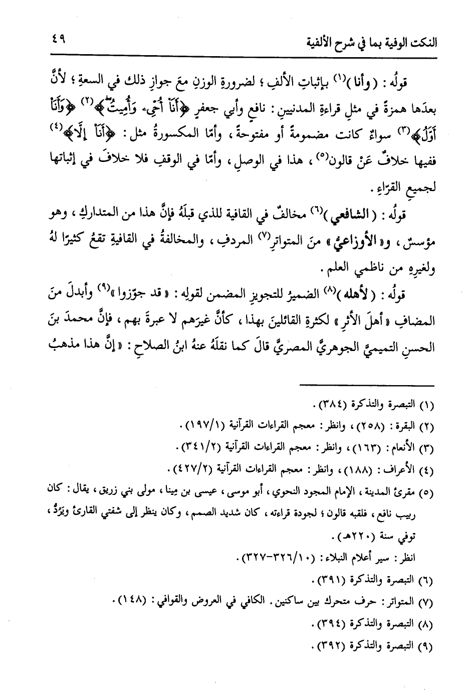 قولهُ: (الشافعي) (¬6) مخالفٌ في القافية للذي قبلَهُ فإنَّ هذا من المتداركِ، وهو مؤسسٌ، و ((الأوزاعيُّ)) منَ المتواترِ (¬7) المردفِ، والمخالفةُ في القافيةِ تقعُ كثيراً لهُ ولغيرِهِ من ناظمي العلم.