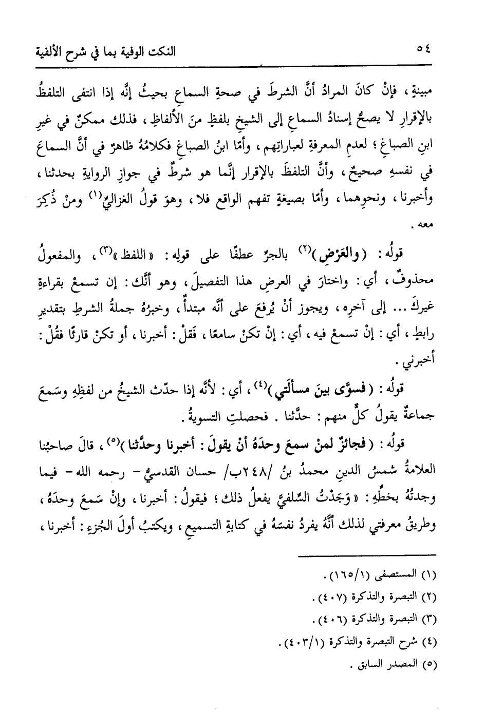 مبينةٍ، فإنْ كانَ المرادُ أنَّ الشرطَ في صحةِ السماعِ بحيثُ إنَّه إذا انتفى التلفظُ بالإقرارِ لا يصحُّ إسنادُ السماعِ إلى الشيخِ بلفظٍ منَ الألفاظِ، فذلك ممكنٌ في غيرِ ابنِ الصباغِ؛ لعدمِ المعرفةِ لعباراتِهم، وأمّا ابنُ الصباغِ فكلامُهُ ظاهرٌ في أنَّ السماعَ في نفسِهِ صحيحٌ، وأنَّ التلفظَ بالإقرار إنَّما هو شرطٌ في جوازِ الروايةِ بحدثنا، وأخبرنا، ونحوِهما، وأمّا بصيغةِ تَفهم الواقعَ فلا، وهوَ قولُ الغزاليِّ (¬1) ومنْ ذُكِرَ معه.