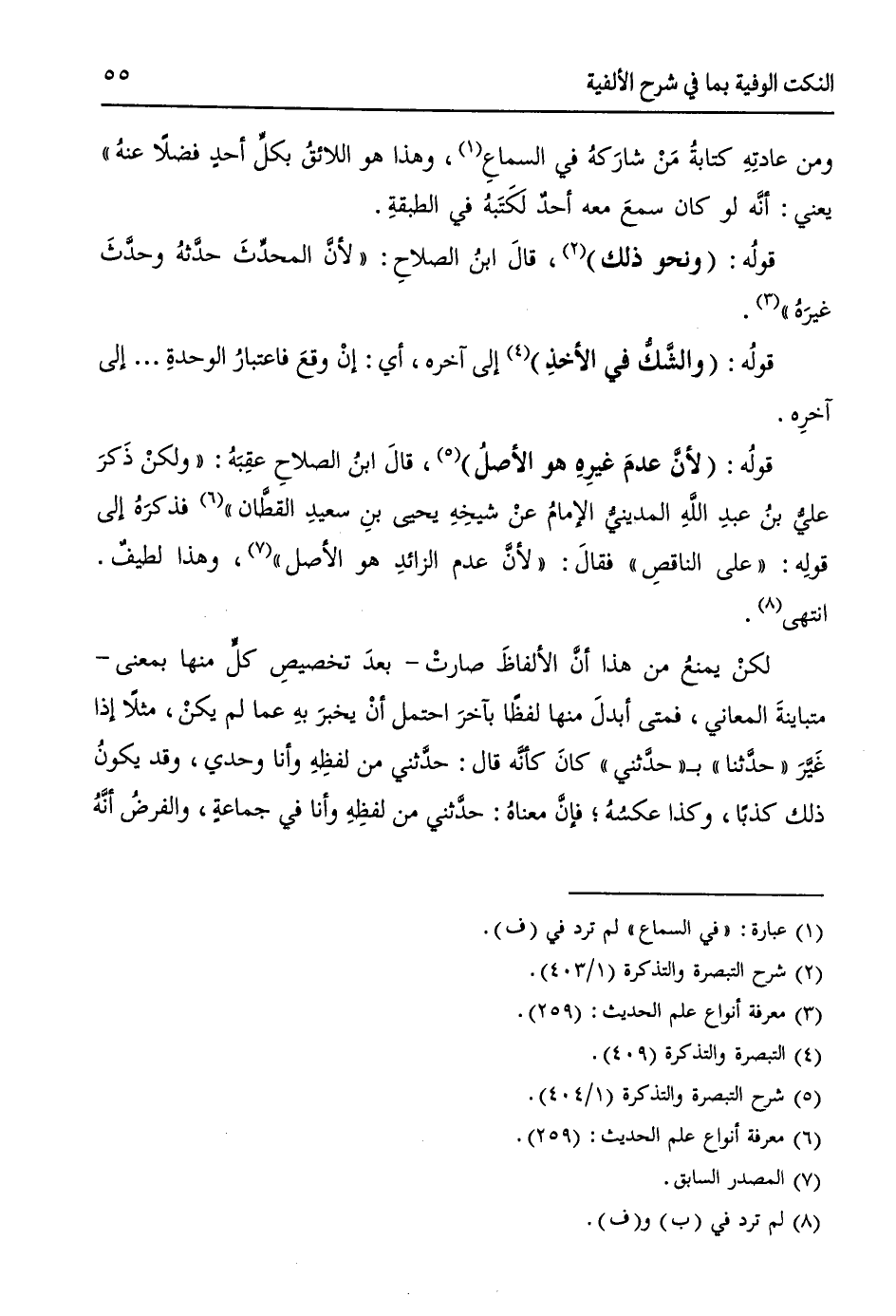 قولهُ: (لأنَّ عدمَ غيرِهِ هو الأصلُ) (¬5)، قالَ ابنُ الصلاحِ عقِبَهُ: ((ولكنْ ذَكرَ عليُّ بنُ عبدِ اللهِ المدينيُّ الإمامُ عنْ شيخِهِ يحيى بنِ سعيدِ القطَّان)) (¬6) فذكرَهُ إلى قولهِ: ((على الناقصِ)) فقالَ: ((لأنَّ عدم الزائدِ هو الأصل)) (¬7)، وهذا لطيفٌ. انتهى (¬8).