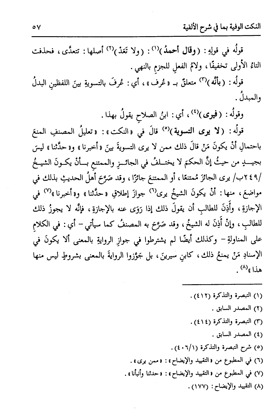 قولهُ: (لا يرى التسوية) (¬5) قالَ في " النكت ": ((تعليلُ المصنفِ المنعَ، باحتمالِ أنْ يكونَ مَنْ قالَ ذلك ممن لا يرى التسويةَ بينَ ((أخبرنا)) و ((حدَّثنا)) ليسَ بجيدٍ من حيثُ إنَّ الحكمَ لا يختلفُ في الجائزِ والممتنعِ بأنْ يَكونَ الشيخُ / 249 ب / يرى الجائزَ مُمتنعاً، أو الممتنعَ جائزاً، وقد صَرَّحَ أهلُ الحديثِ بذلك في مواضعَ، منها: أنْ يكونَ الشيخُ يرى (¬6) جوازَ إطلاقِ ((حدَّثنا)) و ((أخبرنا)) (¬7) في الإجازةِ، وأَذِنَ للطالبِ أن يقولَ ذلك إذا رَوَى عنه بالإجازةِ، فإنَّه لا يجوزُ ذلك للطالبِ، وإنْ أَذِنَ له الشيخُ، وقد صَرَّحَ به المصنفُ كما سيأتي - أي: في الكلامِ على المناولةِ - وكذلك أيضاً لم يشترطوا في جوازِ الروايةِ بالمعنى أنْ لا يكونَ في الإسنادِ مَنْ يَمنعُ ذلك، كابنِ سيرينَ، بل جَوَّزوا الروايةَ بالمعنى بشروطٍ ليس منها هذا)) (¬8).