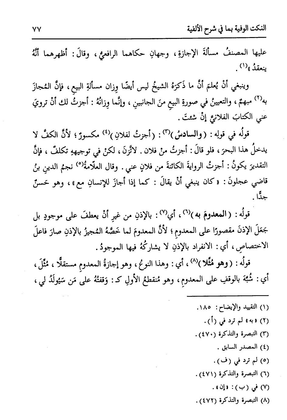 قولهُ في قولهِ: (والسادسُ) (¬3): (أجزتُ لفلانِ) (¬4) مكسورٌ؛ لأنَّ الكفَّ لا يدخلُ هذا البحرَ، فلو قالَ: أجزتُ منْ فلان، لاتَّزنَ، لكنْ في توجيههِ تكلفٌ فإنَّ التقديرَ يكونُ: أجزتُ الروايةَ الكائنةَ من فلانٍ عني، وقالَ العلاّمةُ (¬5) نجمُ الدينِ بنُ قاضي عجلونَ: ((كان ينبغي أنْ يقالَ كما إذا أجازَ للإنسانِ مع))، وهو حَسنٌ جداً.