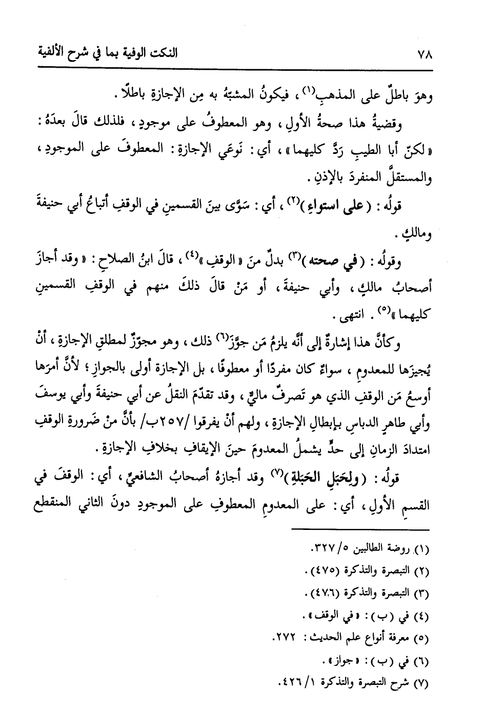 وقولهُ: (في صحته) (¬3) بدلٌ منَ ((الوقفِ)) (¬4)، قالَ ابنُ الصلاحِ: ((وقد أجازَ أصحابُ مالكٍ، وأبي حنيفةَ، أو مَنْ قالَ ذلكَ منهم في الوقفِ القسمينِ كليهما)) (¬5). انتهى.