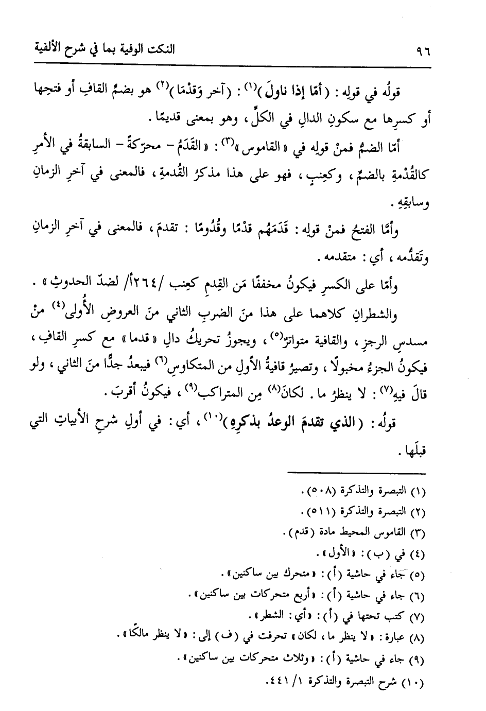 قولهُ: (الذي تقدمَ الوعدُ بذكرِهِ) (¬10)، أي: في أولِ شرحِ الأبياتِ التي قبلَها.
