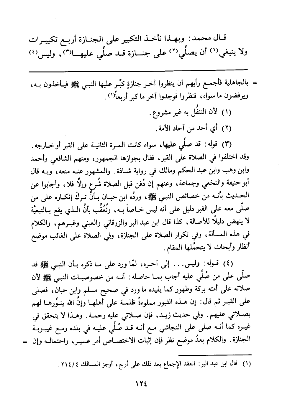 قَالَ مُحَمَّدٌ: وَبِهَذَا نَأْخُذُ التَّكْبِيرُ عَلَى الْجِنَازَةِ أَرْبَعُ تَكْبِيرَاتٍ وَلا يَنْبَغِي (¬1) أَنْ يصلِّي (¬2) عَلَى جنازة قد صلِّي عليها (¬3) ، وليس (¬4)