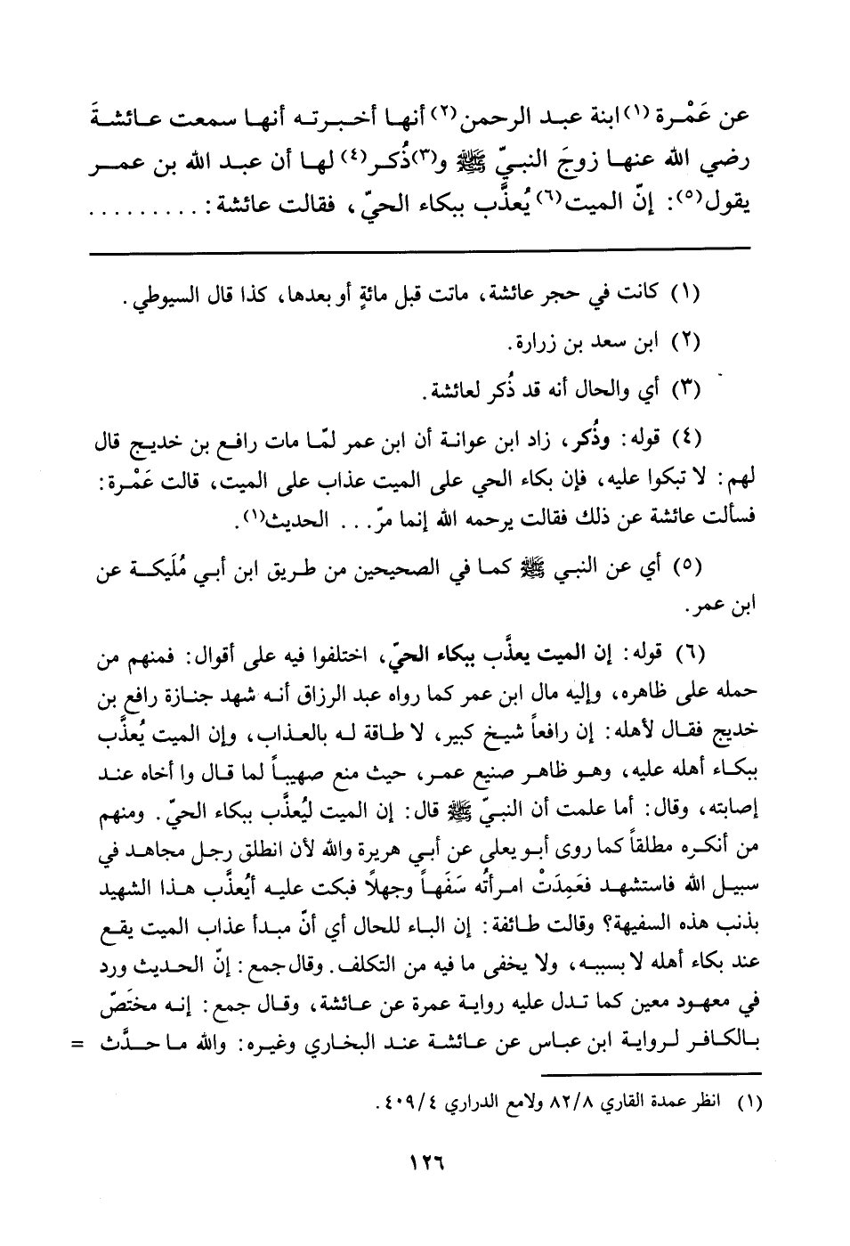 (¬6) قوله: إن الميت يعذَّب ببكاء الحيّ، اختلفوا فيه على أقوال: فمنهم من حمله على ظاهره، وإليه مال ابن عمر كما رواه عبد الرزاق أنه شهد جنازة رافع بن خديج فقال لأهله: إن رافعاً شيخ كبير، لا طاقة له بالعذاب، وإن الميت يُعذَّب ببكاء أهله عليه، وهو ظاهر صنيع عمر، حيث منع صهيباً لما قال وا أخاه عند إصابته، وقال: أما علمت أن النبيّ صلّى الله عليه وسلّم قال: إن الميت ليُعذَّب ببكاء الحيّ. ومنهم من أنكره مطلقاً كما روى أبو يعلى عن أبي هريرة والله لأن انطلق رجل مجاهد في سبيل الله فاستشهد فعَمِدَتْ امرأتُه سَفَهاً وجهلاً فبكت عليه أيُعذَّب هذا الشهيد بذنب هذه السفيهة؟ وقالت: طائفة: إن الباء للحال أي إنّ مبدأ عذاب الميت يقع عند بكاء أهله لا بسببه، ولا يخفى ما فيه من التكلف. وقال جمع: إنَّ الحديث ورد في معهود معين كما تدل عليه رواية عمرة عن عائشة، وقال جمع: إنه مختَصّ بالكافر لرواية ابن عباس عن عائشة عند البخاري وغيره: والله ما حدَّث