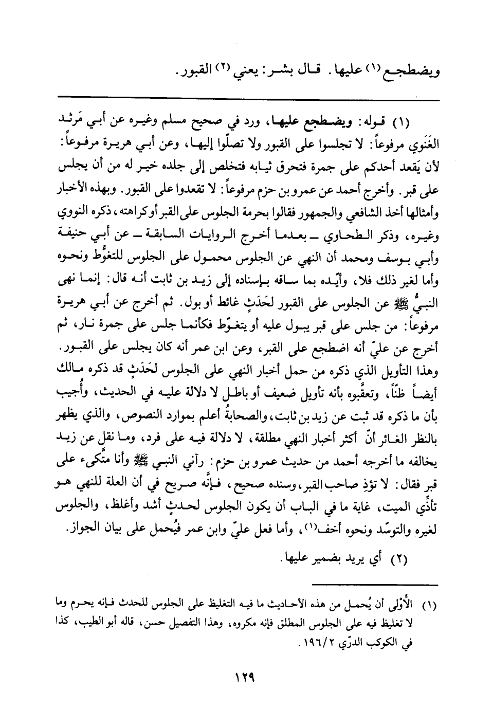 (¬1) قوله: ويضطجع عليها، ورد في صحيح مسلم وغيره عن أبي مَرثد الغَنَوي مرفوعاً: لا تجلسوا على القبور ولا تصلّوا إليها، وعن أبي هريرة مرفوعاً: لأن يَقعد أحدكم على جمرة فتحرق ثيابه فتخلص إلى جلده خير له من أن يجلس على قبر. وأخرج أحمد عن عمرو بن حزم مرفوعاً: لا تقعدوا على القبور. وبهذه الأخبار وأمثالها أخذ الشافعي والجمهور فقالوا بحرمة الجلوس على القبر أو كراهته، ذكره النووي وغيره، وذكر الطحاوي - بعد ما أخرج الروايات السابقة - عن أبي حنيفة وأبي يوسف ومحمد أن النهي عن الجلوس محمول على الجلوس للتغوُّط ونحوه وأما لغير ذلك فلا، وأيّده بما ساقه بإسناده إلى زيد بن ثابت أنه قال: إنما نهى النبيُّ صلّى الله عليه وسلّم عن الجلوس على القبور لحَدَثٍ غائط أو بول. ثم أخرج عن أبي هريرة مرفوعاً: من جلس على قبر يبول عليه أو يتغوَّط فكأنما جلس على جمرة نار، ثم أخرج عن عليّ أنه اضطجع على القبر، وعن ابن عمر أنه كان يجلس على القبور. وهذا التأويل الذي ذكره من حمل أخبار النهي على الجلوس لحَدَثٍ قد ذكره مالك أيضاً ظنّاً، وتعقَّبوه بأنه تأويل ضعيف أو باطل لا دلالة عليه في الحديث، وأُجيب بأن ما ذكره قد ثبت عن زيد بن ثابت، والصحابةُ أعلم بموارد النصوص، والذي يظهر بالنظر الغائر أنّ أكثر أخبار النهي مطلقة، لا دلالة فيه على فرد، وما نقل عن زيد يخالفه ما أخرجه أحمد من حديث عمرو بن حزم: رآني النبي صلّى الله عليه وسلّم وأنا متَّكئ على قبر فقال: لا تؤذِ صاحب القبر، وسنده صحيح، فإنَّه صريح في أن العلة للنهي هو تأذِّي الميت، غاية ما في الباب أن يكون الجلوس لحدثٍ أشد وأغلظ، والجلوس لغيره والتوسّد ونحوه أخف (الأَوْلى أن يُحمل من هذه الأحاديث ما فيه التغليظ على الجلوس للحدث فإنه يحرم وما لا تغليظ فيه على الجلوس المطلق فإنه مكروه، وهذا التفصيل حسن، قاله أبو الطيب، كذا في الكوكب الدرّي 2/196) ، وأما فعل عليّ وابن عمر فيُحمل على بيان الجواز.