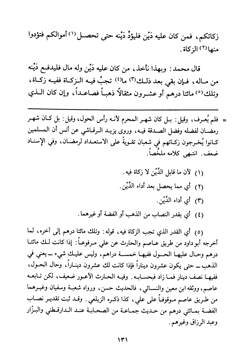 قَالَ مُحَمَّدٌ: وَبِهَذَا نَأْخُذُ، مَنْ كَانَ عَلَيْهِ دَيْن وَلَهُ مَالٌ فَلْيَدْفَعْ دَيْنه مِنْ مَالِهِ، فَإِنْ بَقِيَ بَعْدَ ذَلِكَ (¬3) مَا (¬4) تجبُ فِيهِ الزَّكَاةُ فَفِيهِ زَكَاةٌ، وَتِلْكَ (¬5) مِائَتَا دِرْهَمٍ أَوْ عِشْرُونَ مثقالاً ذهباً فصاعداً، وإن كان الذي