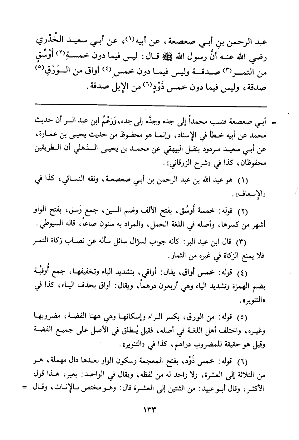 عَبْدِ الرَّحْمَنِ بنِ أَبِي صَعْصَعَةَ، عَنْ أَبِيهِ (¬1) ، عَنْ أَبِي سَعِيدٍ الخُدْري رَضِيَ اللَّهُ عَنْهُ أنَّ رسول الله صلى الله عليه وسلم قَالَ: لَيْسَ فِيمَا دُونَ خمسةِ (¬2) أَوْسُقٍ مِنَ التَّمْرِ (¬3) صَدَقَةٌ وَلَيْسَ فِيمَا دُونَ خمسِ (¬4) أَوَاقٍ مِنَ الوَرْقِ (¬5) صَدَقَةٌ، وَلَيْسَ فِيمَا دُونَ خَمْسٍ ذَوْدٍ (¬6) من الإِبل صدقة.