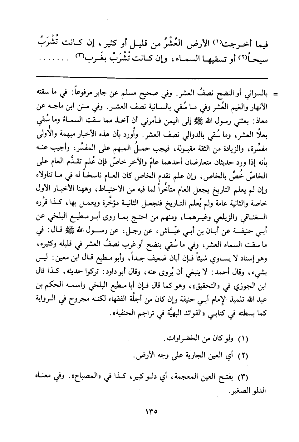 بالسواني أو النضح نصفُ العشر. وفي صحيح مسلم عن جابر مرفوعاً: في ما سقته الأنهار والغيم العُشر وفي ما سُقي بالسانية نصف العشر. وفي سنن ابن ماجه عن معاذ: بعثني رسول الله صلّى الله عليه وسلّم إلى اليمن فأمرني أن آخذ مما سقت السماءُ وما سُقي بعلاً العشر، وما سُقي بالدوالي نصف بالعشر. وأُورد بأن هذه الأخبار مبهمة والأُولى مفسِّرة، والزيادة من الثقة مقبولة، فيجب حملُ المبهم على المفسَّر، وأجيب عنه بأنه إذا ورد حديثان متعارضان أحدهما عامّ والآخر خاصّ فإن عُلم تقدُّم العام على الخاصّ خُصَّ بالخاص، وإن علم تقدم الخاص كان العام ناسخاً له في ما تناولاه وإن لم يعلم التاريخ يجعل العام متأخِّراً لما فيه من الاحتياط، وههنا الأخبار الأول خاصة والثانية عامة ولم يُعلم التاريخ فنجعل الثانية مؤخَّرة ويعمل بها، كذا قرَّره السغناقي والزيلعي وغيرهما، ومنهم من احتج بما روى أبو مطيع البلخي عن أبي حنيفة عن أبان بن أبي عيّاش، عن رجل، عن رسول الله صلّى الله عليه وسلّم قال: في ما سقت السماء العشر، وفي ما سُقي بنضح أو غرب نصفُ العشر في قليله وكثيره، وهو إسناد لا يساوي شيئاً فإن أبان ضعيف جداً، وأبو مطيع قال ابن معين: ليس بشيء، وقال أحمد: لا ينبغي أن يُروى عنه، وقال أبو داود: تركوا حديثه، كذا قال ابن الجوزي في "التحقيق"، وهو كما قال فإن أبا مطيع البلخي واسمه الحكم بن عبد الله تلميذ الإِمام أبي حنيفة وإن كان من أجلَّة الفقهاء لكنه مجروح في الرواية كما بسطته في كتابي "الفوائد البهيَّة في تراجم الحنفية".