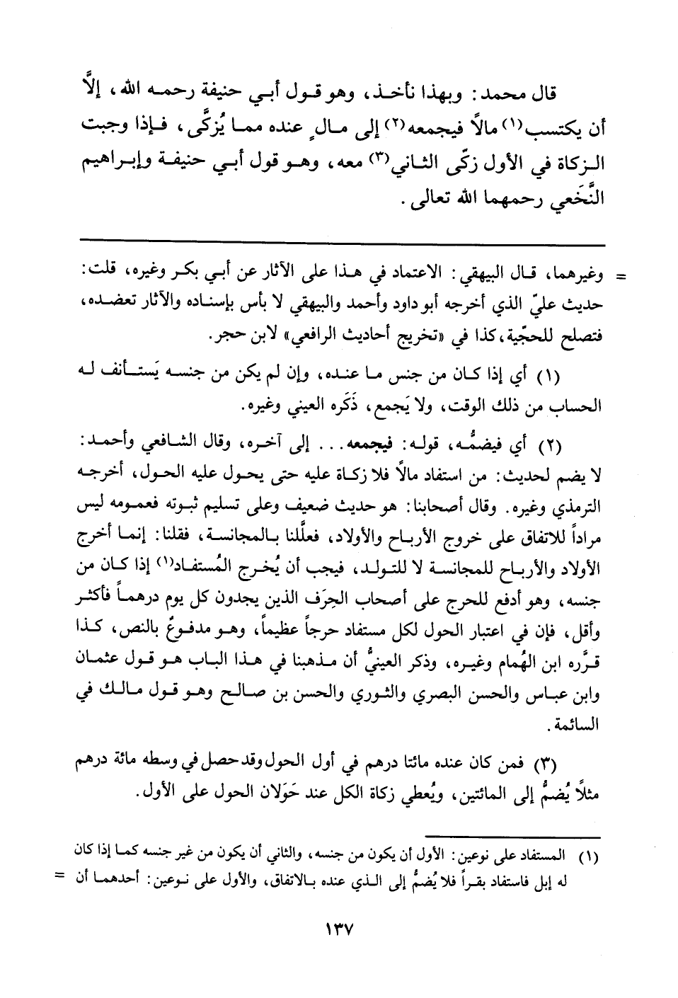 وانظر البحث الشافي في البدائع 2/13، والمغني 2/496 وما بعدها) إذا كان من جنسه، وهو أدفع للحرج على أصحاب الحِرَف الذين يجدون كل يوم درهماً فأكثر وأقل، فإن في اعتبار الحول لكل مستفاد حرجاً عظيماً، وهو مدفوعٌ بالنص، كذا قرَّره ابن الهُمام وغيره، وذكر العينيُّ أن مذهبنا في هذا الباب هو قول عثمان وابن عباس والحسن البصري والثوري والحسن بن صالح وهو قول مالك في السائمة.