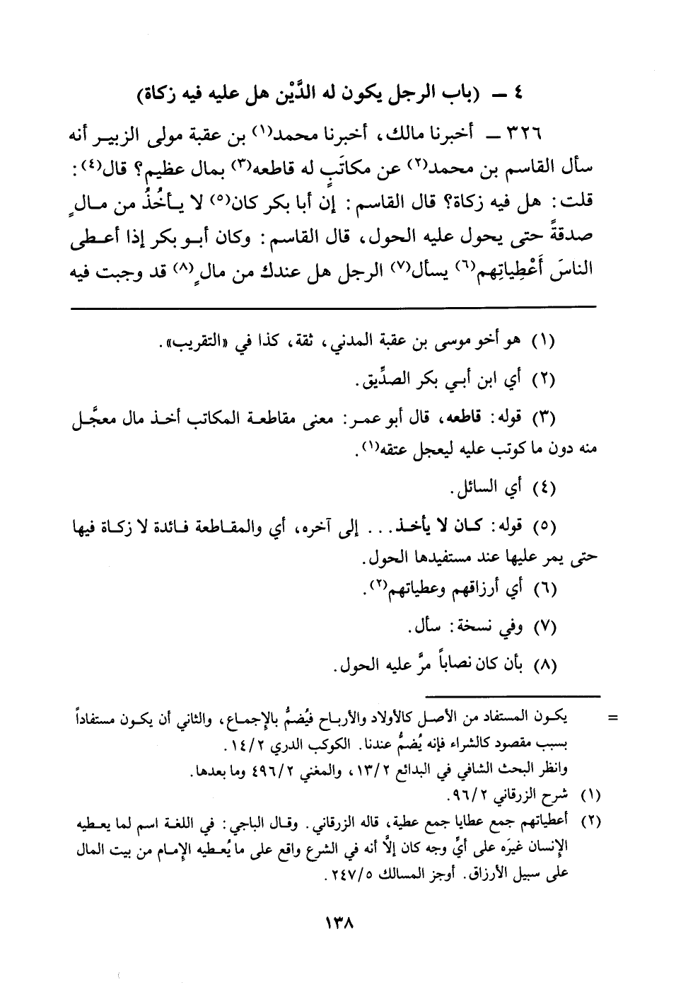 326 - أَخْبَرَنَا مَالِكٌ، أَخْبَرَنَا مُحَمَّدُ (¬1) بْنُ عُقْبَةَ مَوْلَى الزُّبَيْرِ أَنَّهُ سَأَلَ الْقَاسِمَ بْنَ مُحَمَّدٍ (¬2) عَنْ مكاتَبٍ لَهُ قَاطَعَهُ (¬3) بِمَالٍ عَظِيمٍ؟ قَالَ (¬4) : قُلْتُ: هَلْ فِيهِ زَكَاةٌ؟ قَالَ الْقَاسِمُ: إِنَّ أَبَا بَكْرٍ كَانَ (¬5) لا يأخُذُ مِنْ مالٍ صَدَقَةً حَتَّى يَحُولَ عَلَيْهِ الْحَوْلُ، قَالَ الْقَاسِمُ: وَكَانَ أَبُو بَكْرٍ إِذَا أَعْطَى الناسَ أَعْطِياتِهم (¬6) يَسْأَلُ (¬7) الرَّجُلَ هَلْ عِنْدَكَ مِنْ مالٍ (¬8) قد وجبت فيه