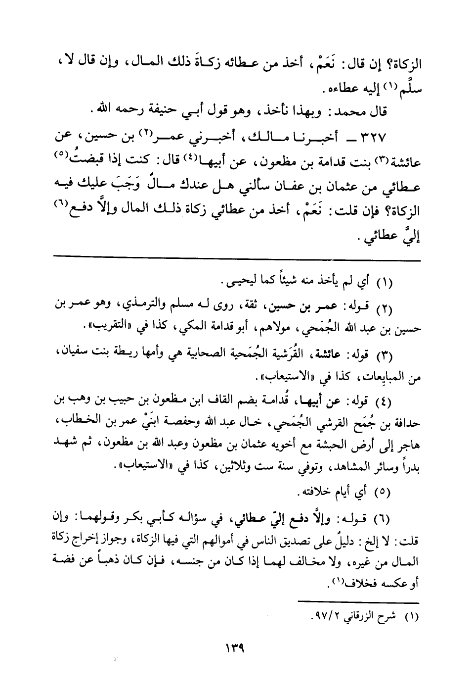 327 - أَخْبَرَنَا مَالِكٌ، أَخْبَرَنِي عُمَرُ (¬2) بْنُ حُسَيْنٍ، عَنْ عَائِشَةَ (¬3) بِنْتِ قُدَامَةَ بْنِ مَظْعُونٍ، عَنْ أَبِيهَا (¬4) قَالَ: كُنْتُ إِذَا قبضتُ (¬5) عَطَائِي مِنْ عُثْمَانَ بْنِ عَفَّانَ سَأَلَنِي هَلْ عِنْدَكَ مالٌ وَجَبَ عَلَيْكَ فِيهِ الزَّكَاةُ؟ فَإِنْ قُلْتُ: نَعَمْ، أَخَذَ مِنْ عَطَائِي زَكَاةَ ذَلِكَ الْمَالِ وإلاَّ دَفَعَ (¬6) إليَّ عَطَائِي.