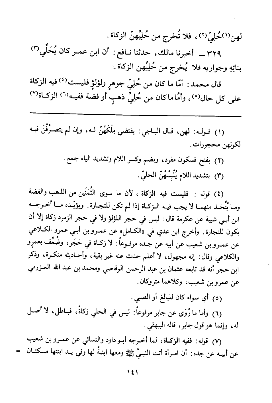 329 - أَخْبَرَنَا مَالِكٌ، حَدَّثَنَا نَافِعٌ: أَنَّ ابْنَ عُمَرَ كَانَ يُحَلِّي (¬3) بناتِهِ وَجَوَارِيهِ فَلا يُخرج مِنْ حُلِيِّهنّ الزَّكَاةَ.