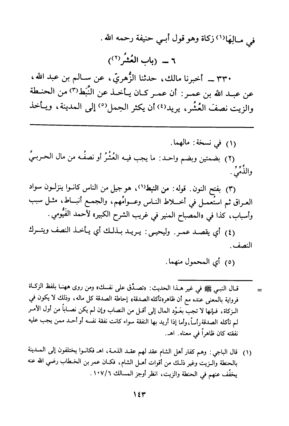 330 - أَخْبَرَنَا مَالِكٌ، حَدَّثَنَا الزُّهريّ، عن سالم بن عبد الله، عن عَبْدِ اللَّهِ بْنِ عُمَرَ: أَنَّ عُمَرَ كَانَ يَأْخُذُ عَنِ النَّبَط (¬3) مِنَ الْحِنْطَةِ وَالزَّيْتِ نصفَ العُشُر، يُرِيدُ (¬4) أَنْ يُكْثِرَ الحِمل (¬5) إِلَى الْمَدِينَةِ، ويأخذ