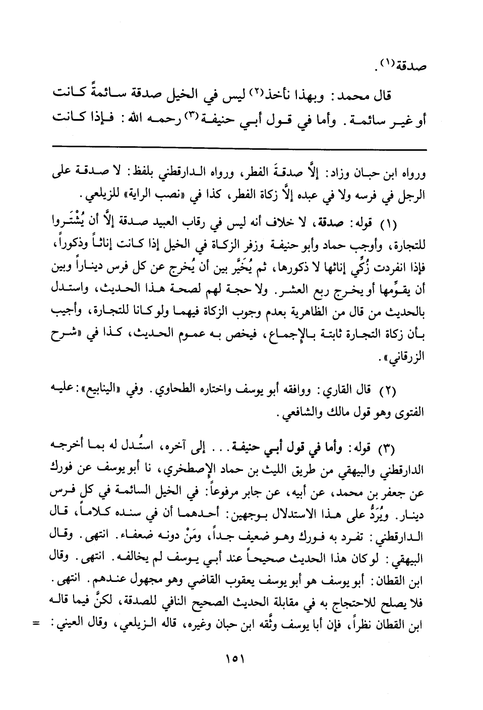 (¬3) قوله: وأما في قول أبي حنيفة ... إلى آخره، استُدل له بما أخرجه الدارقطني والبيهقي من طريق الليث بن حماد الإِصطخري، نا أبو يوسف عن فورك عن جعفر بن محمد، عن أبيه، عن جابر مرفوعاً: في الخيل السائمة في كل فرس دينار. ويُرَدُّ على هذا الاستدلال بوجهين: أحدهما أن في سنده كلاماً، قال الدارقطني: تفرد به فورك وهو ضعيف جداً، ومَنْ دونه ضعفاء. انتهى. وقال البيهقي: لو كان هذا الحديث صحيحاً عند أبي يوسف لم يخالفه. انتهى. وقال ابن القطان: أبو يوسف هو أبو يوسف يعقوب القاضي وهو مجهول عندهم. انتهى.