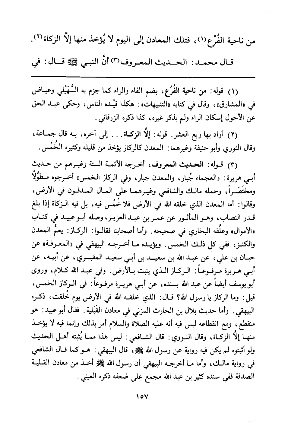 (¬3) قوله: الحديث المعروف، أخرجه الأئمة الستة وغيرهم من حديث أبي هريرة: "العجماء جُبار، والمعدن جبار، وفي الركاز الخمس" أخرجوه مطوَّلاً ومختَصَراً، وحمله مالك والشافعي وغيرهما على المال المدفون في الأرض، وقالوا: أما المعدن الذي خلقه الله في الأرض فلا خُمُس فيه، بل فيه الزكاة إذا بلغ قدر النصاب، وهو المأثور عن عمر بن عبد العزيز، وصله أبو عبيد في كتاب "الأموال" وعلَّقه البخاري في صحيحه. وأما أصحابنا فقالوا: الركاز: يعمُّ المعدن والكنز، ففي كل ذلك الخمس. ويؤيده ما أخرجه البيهقي في "المعرفة" عن حبان بن علي، عن عبد الله بن سعيد بن أبي سعيد المقبري، عن أبيه، عن أبي هريرة مرفوعاً: الركاز الذي ينبت بالأرض. وفي عبد الله كلام، وروى أبو يوسف أيضاً عن عبد الله بسنده، عن أبي هريرة مرفوعاً: في الركاز الخمس، قيل: وما الركاز يا رسول الله؟ قال: الذي خلقه الله في الأرض يوم خُلقت، ذكره البيهقي. وأما حديث بلال بن الحارث المزني في معادن القَبَلية. فقال أبو عبيد: هو منقطع، ومع انقطاعه ليس فيه أنه عليه الصلاة والسلام أمر بذلك وإنما فيه لا يؤخذ منها إلاَّ الزكاة، وقال النووي: قال الشافعي: ليس هذا مما يُثبته أهل الحديث ولو أثبتوه لم يكن فيه رواية عن رسول الله صلّى الله عليه وسلّم، قال البيهقي: هو كما قال الشافعي في رواية مالك، وأما ما أخرجه البيهقي أن رسول الله صلّى الله عليه وسلّم أخذ من معادن القبلية الصدقة ففي سنده كثير بن عبد الله مجمع على ضعفه ذكره العيني.