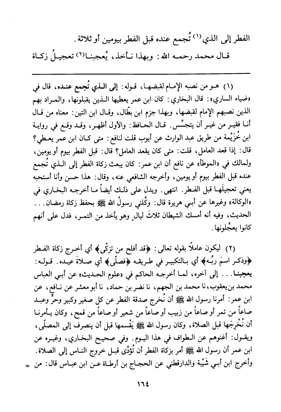 (¬2) ليكون عاملاً بقوله تعالى: {قد أفلح من تزكّى} أي أخرج زكاة الفطر {وذكر اسمَ ربِّه} أي بالتكبير في طريقه {فصلّى} أي صلاةَ عيده. قوله: يعجبنا ... إلى آخره، لما أخرجه الحاكم في "علوم الحديث" عن أبي العباس محمد بن يعقوب، نا محمد بن الجهم، نا نضر بن حماد، نا أبو معشر عن نافع، عن ابن عمر: أمرنا رسول الله صلّى الله عليه وسلّم أن نُخرج صدقة الفطر عن كل صغير وكبير وحرٍّ وعبد صاعاً من تمر أو صاعاً من زبيب أو صاعاً من شعير أو صاعاً من قمح، وكان يأمرنا أن نُخْرِجَها قبل الصلاة، وكان رسول الله صلّى الله عليه وسلّم يَقْسمها قبل أن ينصرف إلى المصلّى، ويقول: أغنوهم عن الطواف في هذا اليوم. وفي صحيح البخاري، وغيره عن ابن عمر أن رسول الله صلّى الله عليه وسلّم أمر بزكاة الفطر أن تُؤدَّى قبل خروج الناس إلى الصلاة. وأخرج ابن أبي شيبة والدارقطني عن الحجاج بن أرطاة عن ابن عباس قال: من