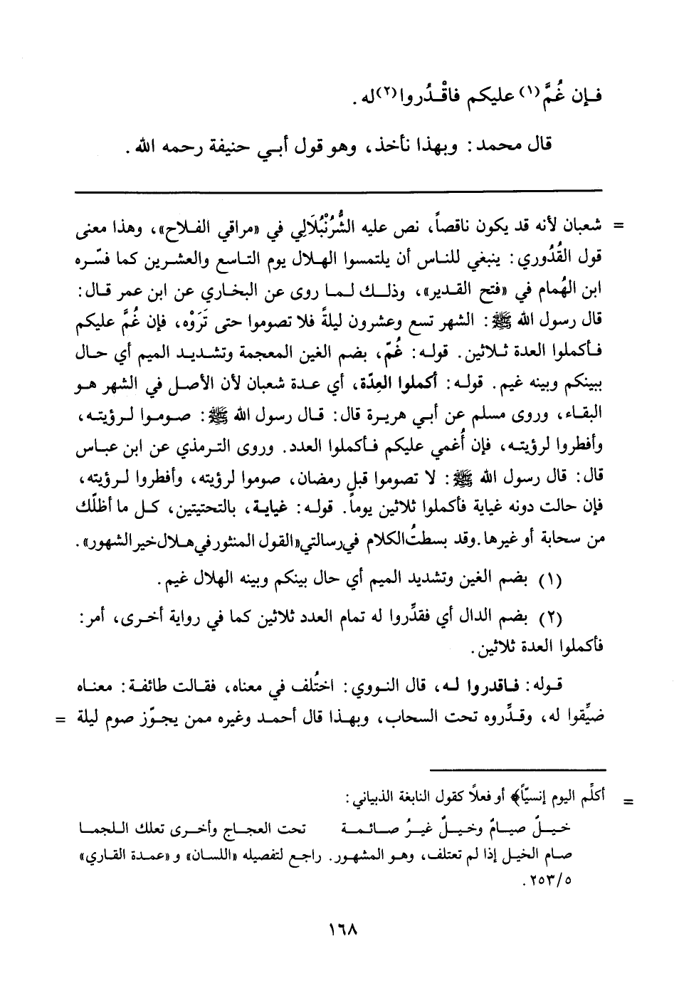 شعبان لأنه قد يكون ناقصاً، نص عليه الشرنبلالي في "مراقي الفلاح" وهذا معنى قول القُدُوري: ينبغي للناس أن يلتمسوا الهلال يوم التاسع والعشرين كما فسّره ابن الهمام في "فتح القدير "، وذلك لما روى عن البخاري عن ابن عمر قال: قال رسول الله صلى الله عليه وسلم: الشهر تسع وعشرون ليلةً فلا تصوموا حتى تَرَوْه، فإن غَمَّ عليكم فأكملوا العدة ثلاثين. قوله: غُمّ، بضم الغين المعجمة وتشديد الميم أي حال بينكم وبينه غيم. قوله: أكملوا العَدّة، أي عدة شعبان لأن الأصل في الشهر هو البقاء، وروى مسلم عن أبي هريرة قال: قال رسول الله صلى الله وسلم: صوموا لرؤيته، وأفطروا لرؤيته، فإن أُغمي عليكم فأكملوا العدد. وروى الترمذي عن ابن عباس قال: قال رسول الله صلى الله عليه وسلم: لا تصوموا قبل رمضان، صوموا لرؤيته، وأفطروا لرؤيته، فإن حالت دونه غياية فأكملوا ثلاثين يوماً. قوله: غياية، بالتحتيتين، كل ما أظلّك من سحابة أو غيرها. وقد بسطتُ الكلام في رسالتي "القول المنثور في هلال خير الشهور".
