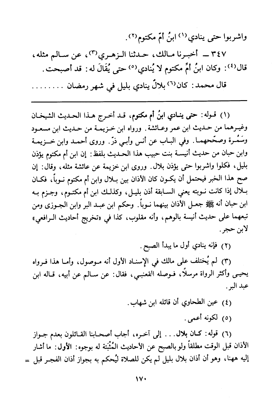 347 - أَخْبَرَنَا مَالِكٌ، حَدَّثَنَا الزُّهْرِيُّ (¬3) ، عَنْ سَالِمٍ مِثْلَهُ، قَالَ (¬4) : وَكَانَ ابنُ أمِّ مَكْتُومٍ لا يُنادي (¬5) حَتَّى يُقَالَ لَهُ: قَدْ أَصْبَحْتَ.