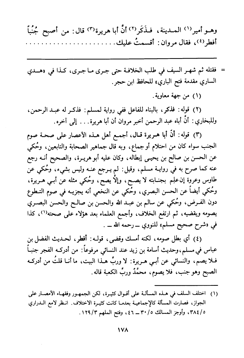(¬3) قوله: أنَّ أبا هريرة قال، أجمع أهل هذه الأعصار على صحة صوم الجنب سواء كان من احتلام أو جماع، وبه قال جماهير الصحابة والتابعين، وحُكي عن الحسن بن صالح بن يحيى إبطاله، وكان عليه أبو هريرة، والصحيح أنه رجع عنه كما صرح به في رواية مسلم، وقيل: لم يرجع عنه وليس بشيء، وحُكي عن طاوس وعروة إن علِم بجنابته لا يصح، وإلاَّ يصح، وحُكي مثله عن أبي هريرة، وحُكي أيضاً عن الحسن البصري، وحُكي عن النخعي أنه يجزيه في صوم التطوع دون الفرض، وحُكي عن سالم بن عبد الله والحسن بن صالح والحسن البصري يصومه ويقضيه، ثم ارتفع الخلاف، وأجمع العلماء بعد هؤلاء على صحته (اختلف السلف في هذه المسألة على أقوال كثيرة، لكن الجمهور وفقهاء الأمصار على الجواز، فصارت المسألة كالإِجماعية بعدما كانت كثيرة الاختلاف. انظر لامع الدراري 5/384، وأوجز المسالك 5/30 - 46، وفتح الملهم 3/129) ، كذا في "شرح صحيح مسلم" للنووي - رحمه الله -