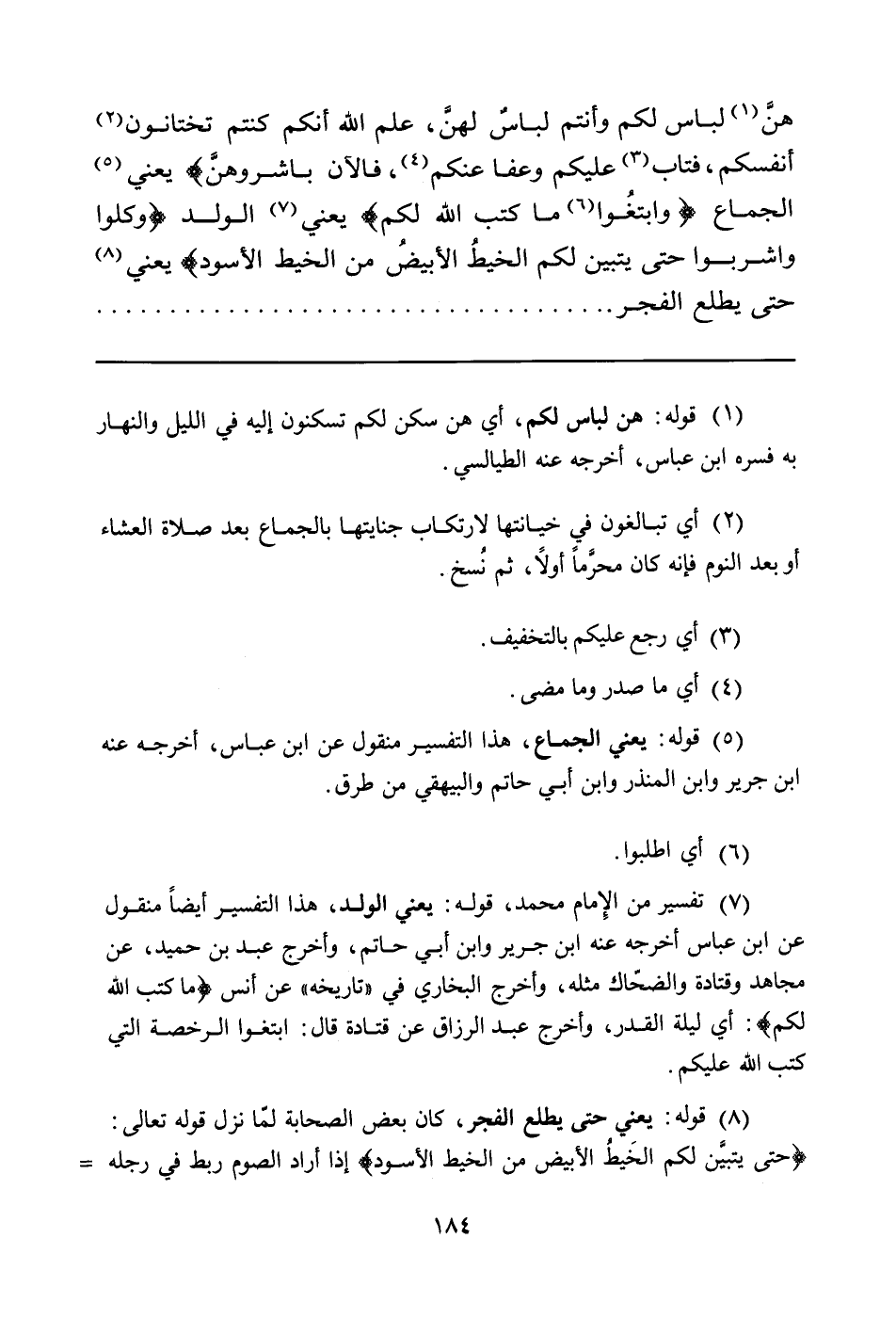 هنَّ (¬1) لِبَاسٌ لَكُمْ وَأَنْتُمْ لباسٌ لهنَّ، عَلِمَ اللَّهُ أَنَّكُمْ كُنْتُمْ تَخْتَانُونَ (¬2) أَنْفُسَكُمْ، فَتَابَ (¬3) عَلَيْكُمْ وعفا عنكم (¬4) ، فالآن باشروهنَّ} يعني (¬5) الجماع {وابتغُوا (¬6) ما كتب الله لكم} يَعْنِي (¬7) الْوَلَدَ {وَكُلُوا وَاشْرَبُوا حَتَّى يَتَبَيَّنَ لَكُمُ الخيطُ الأبيضُ من الخيط الأسود} يعني (¬8) حتى يطلع الفجر