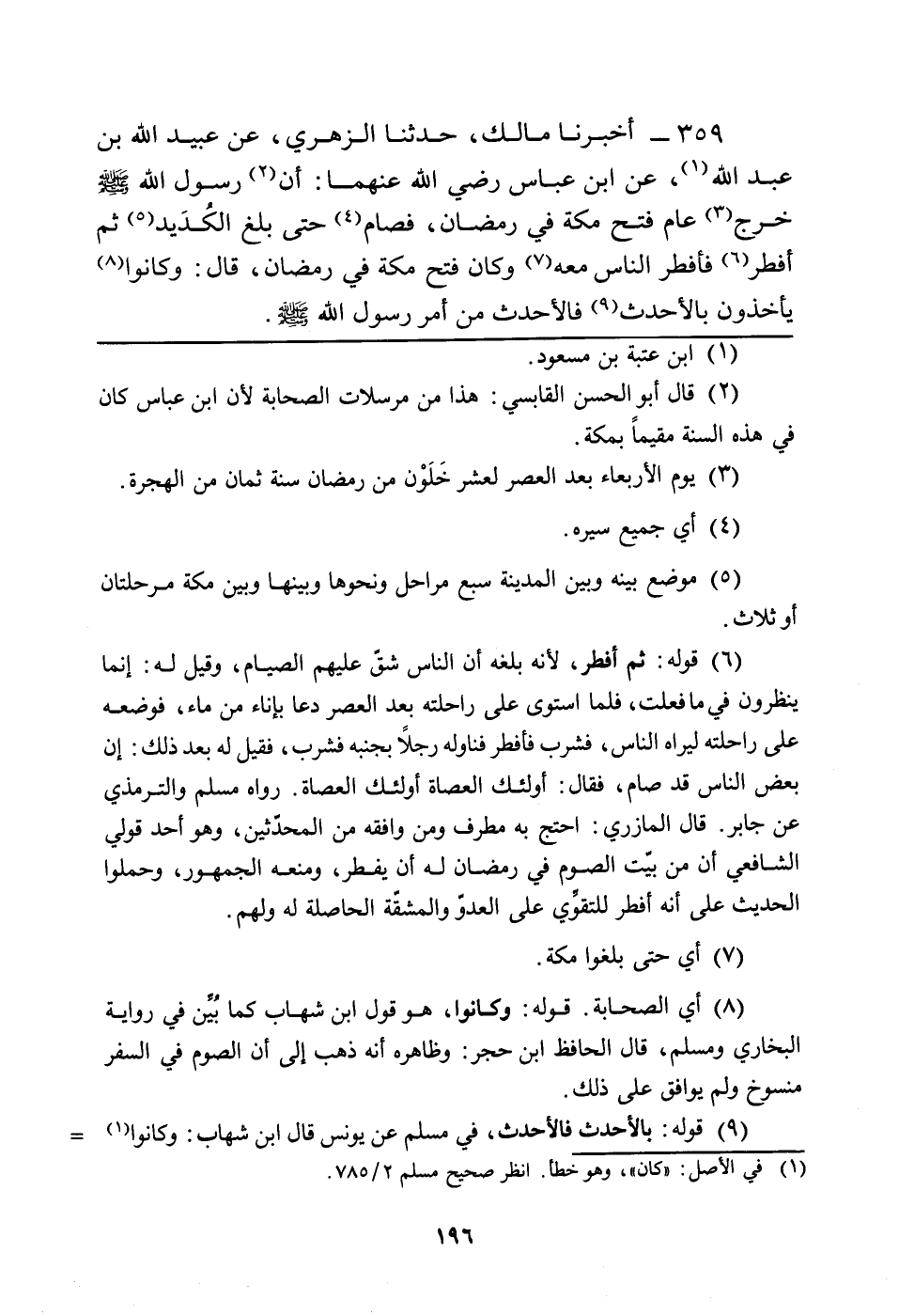 359 - أَخْبَرَنَا مَالِكٌ، حَدَّثَنَا الزُّهْرِيُّ، عَنْ عُبَيْدِ اللَّهِ بْنِ عَبْدِ اللَّهِ (¬1) ، عَنِ ابْنِ عَبَّاسٍ رَضِيَ اللَّهُ عَنْهُمَا: أَنّ (¬2) رَسُولَ اللَّهِ صَلَّى اللَّهُ عَلَيْهِ وَسَلَّمَ خَرَجَ (¬3) عَامَ فَتْحِ مَكَّةَ فِي رَمَضَانَ، فَصَامَ (¬4) حَتَّى بَلَغَ الكُدَيد (¬5) ثُمَّ أَفْطَرَ (¬6) فَأَفْطَرَ النَّاسُ مَعَهُ (¬7) وَكَانَ فَتْحُ مَكَّةَ فِي رَمَضَانَ، قَالَ: وَكَانُوا (¬8) يَأْخُذُونَ بِالأَحْدَثِ (¬9) فَالأَحْدَثِ مِنْ أَمْرِ رَسُولِ اللَّهِ صَلَّى اللَّهُ عليه وسلّم.