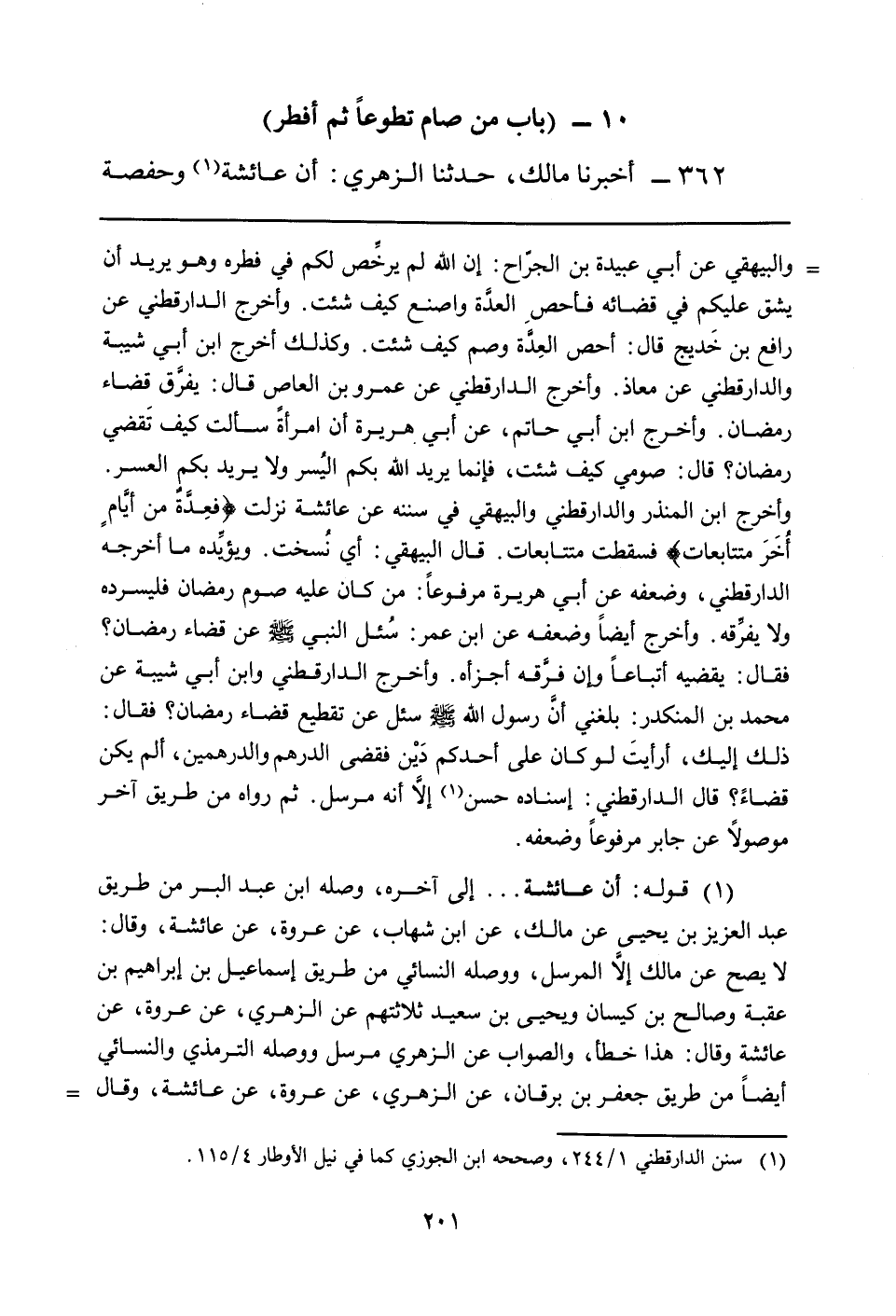 والبيهقي عن أبي عبيدة بن الجرّاح: إن الله لم يرخِّص لكم في فطره وهو يريد أن يشق عليكم في قضائه فأحصِ العدَّة واصنع كيف شئت. وأخرج الدارقطني عن رافع بن خَديج قال: أحص العِدَّة وصم كيف شئت. وكذلك أخرج ابن أبي شيبة والدارقطني عن معاذ. وأخرج الدارقطني عن عمرو بن العاص قال: يفرَّق قضاء رمضان. وأخرج ابن أبي حاتم، عن أبي هريرة أن امرأةً سألت كيف تَقضي رمضان؟ قال: صومي كيف شئت، فإنما يريد الله بكم اليُسر ولا يريد بكم العسر. وأخرج ابن المنذر والدارقطني والبيهقي في سننه عن عائشة نزلت {فعِدَّةٌ مِنْ أيّامٍ أُخرَ متتابعات} فسقطت متتابعات. قال البيهقي: أي نُسخت. ويؤيِّده ما أخرجه الدارقطني، وضعفه عن أبي هريرة مرفوعاً: من كان عليه صوم رمضان فليسرده ولا يفرِّقه. وأخرج أيضاً وضعفه عن ابن عمر: سُئل النبي صلّى الله عليه وسلّم عن قضاء رمضان؟ فقال: يقضيه أتباعاً وإن فرَّقه أجزأه. وأخرج الدارقطني وابن أبي شيبة عن محمد بن المنكدر: بلغني أنَّ رسول الله صلّى الله عليه وسلّم سئل عن تقطيع قضاء رمضان؟ فقال: ذلك إليك، أرأيتَ لو كان على أحدكم دَيْن فقضى الدرهم والدرهمين، ألم يكن قضاءً؟ قال الدارقطني: إسناده حسن (سنن الدارقطني 1/244، وصححه ابن الجوزي كما في نيل الأوطار 4/115) إلاَّ أنه مرسل. ثم رواه من طريق آخر موصولاً عن جابر مرفوعاً وضعفه.