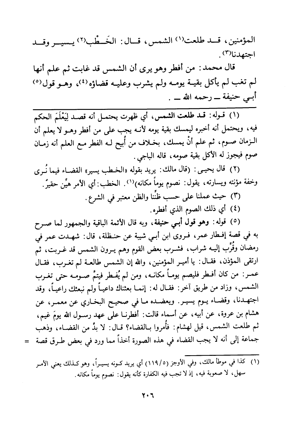 (¬2) قال يحيى: (قال مالك: يريد بقوله "الخطب يسير" القضاء فيما نُرى وخفة مؤنته ويسارته، يقول: نصوم يوماً مكانه) (كذا في موطأ مالك، وفي الأوجز 5/119، أي يريد كونه يسيراً، وهو كذلك يعني الأمر سهل، لا صعوبة فيه، إذ لا تجب فيه الكفارة كأنه يقول: نصوم يوماً مكانه) . الخطب: أي الأمر هيِّن حقيرٌ.