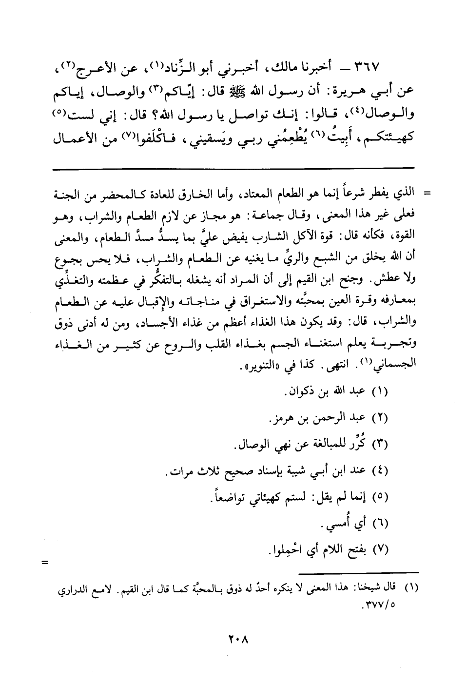367 - أَخْبَرَنَا مَالِكٌ، أَخْبَرَنِي أَبُو الزِّناد (¬1) ، عَنِ الأَعْرَجِ (¬2) ، عن أبي هريرة: أن رسول الله صلى اللَّهُ عَلَيْهِ وَسَلَّمَ قَالَ: إِيَّاكُمْ (¬3) وَالْوِصَالَ، إِيَّاكُمْ وَالْوِصَالَ (¬4) ، قَالُوا: إِنَّكَ تُوَاصِلُ يَا رَسُولَ اللَّهِ؟ قَالَ: إِنِّي لَسْتُ (¬5) كَهَيْئَتِكُمْ، أبِيت (¬6) يُطْعِمُني رَبِّي ويَسقيني، فاكْلَفوا (¬7) من الأعمال