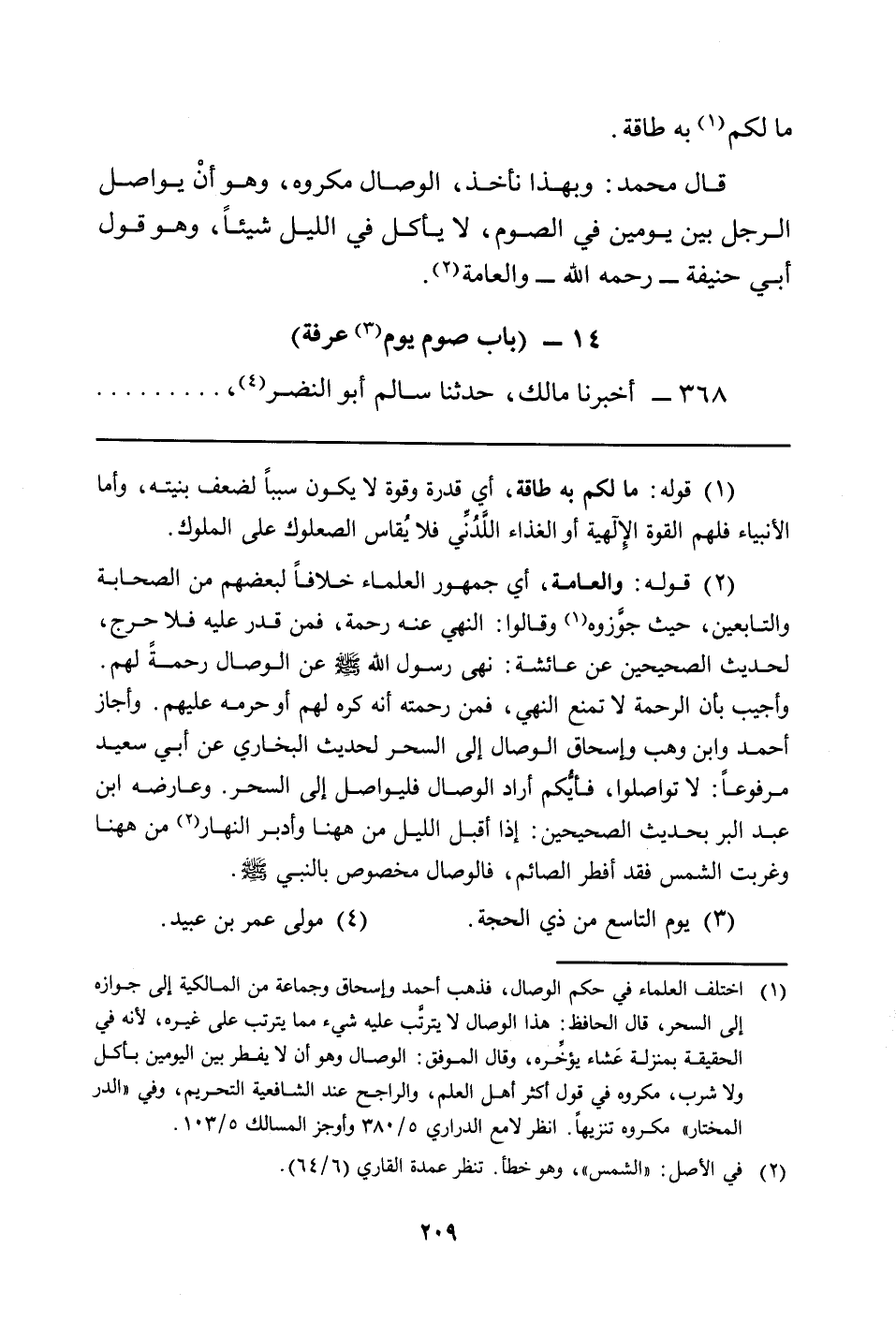 (¬2) قوله: والعامة، أي جمهور العلماء خلافاً لبعضهم من الصحابة والتابعين، حيث جوَّزوه (اختلف العلماء في حكم الوصال، فذهب أحمد وإسحاق وجماعة من المالكية إلى جوازه إلى السحر، قال الحافظ: هذا الوصال لا يترتَّب عليه شيء مما يترتب على غيره، لأنه في الحقيقة بمنزلة عَشاء يؤخِّره، وقال الموفق: الوصال وهو أن لا يفطر بين اليومين بأكل ولا شرب، مكروه في قول أكثر أهل العلم، والراجح عند الشافعية التحريم، وفي "الدر المختار" مكروه تنزيهاً. انظر لامع الدراري 5/380 وأوجز المسالك 5/103) وقالوا: النهي عنه رحمة، فمن قدر عليه فلا حرج، لحديث الصحيحن عن عائشة: نهى رسول الله صلّى الله عليه وسلّم عن الوصال رحمةً لهم. وأجيب بأن الرحمة لا تمنع النهي، فمن رحمته أنه كره لهم أو حرمه عليهم. وأجاز أحمد وابن وهب وإسحاق الوصال إلى السحر لحديث البخاري عن أبي سعيد مرفوعاً: لا تواصلوا، فأيُّكم أراد الوصال فليواصل إلى السحر. وعارضه ابن عبد البر بحديث الصحيحين: إذا أقبل الليل من ههنا وأدبر النهار (في الأصل: "الشمس"، وهو خطأ. تنظر عمدة القاري 6/64) من ههنا وغربت الشمس فقد أفطر الصائم، فالوصال مخصوص بالنبي صلّى الله عليه وسلّم.