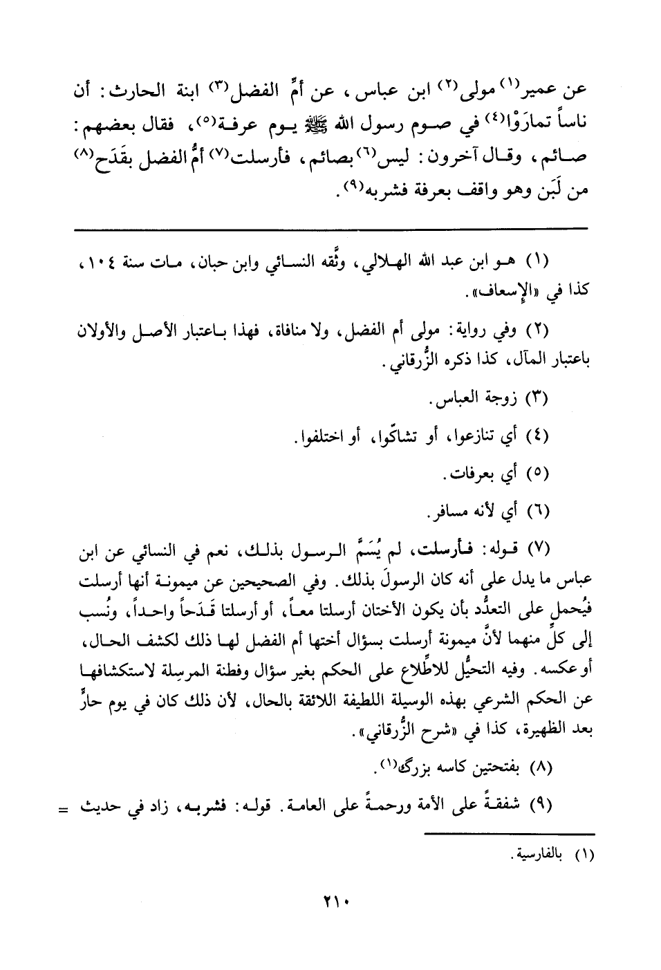 عَنْ عُمَيْرٍ (¬1) مَوْلَى (¬2) ابْنِ عَبَّاسٍ، عَنْ أمِّ الْفَضْلِ (¬3) ابْنَةِ الْحَارِثِ: أَنَّ نَاسًا تمارَوْا (¬4) فِي صَوْمِ رَسُولِ اللَّهِ صَلَّى اللَّهُ عَلَيْهِ وَسَلَّمَ يَوْمَ عَرَفَةَ (¬5) ، فَقَالَ بَعْضُهُمْ: صَائِمٌ، وَقَالَ آخَرُونَ: لَيْسَ (¬6) بِصَائِمٍ، فَأَرْسَلَتْ (¬7) أمُّ الْفَضْلِ بقَدَح (¬8) مِنْ لَبَن وهو واقف بعرفة فشربه (¬9) .