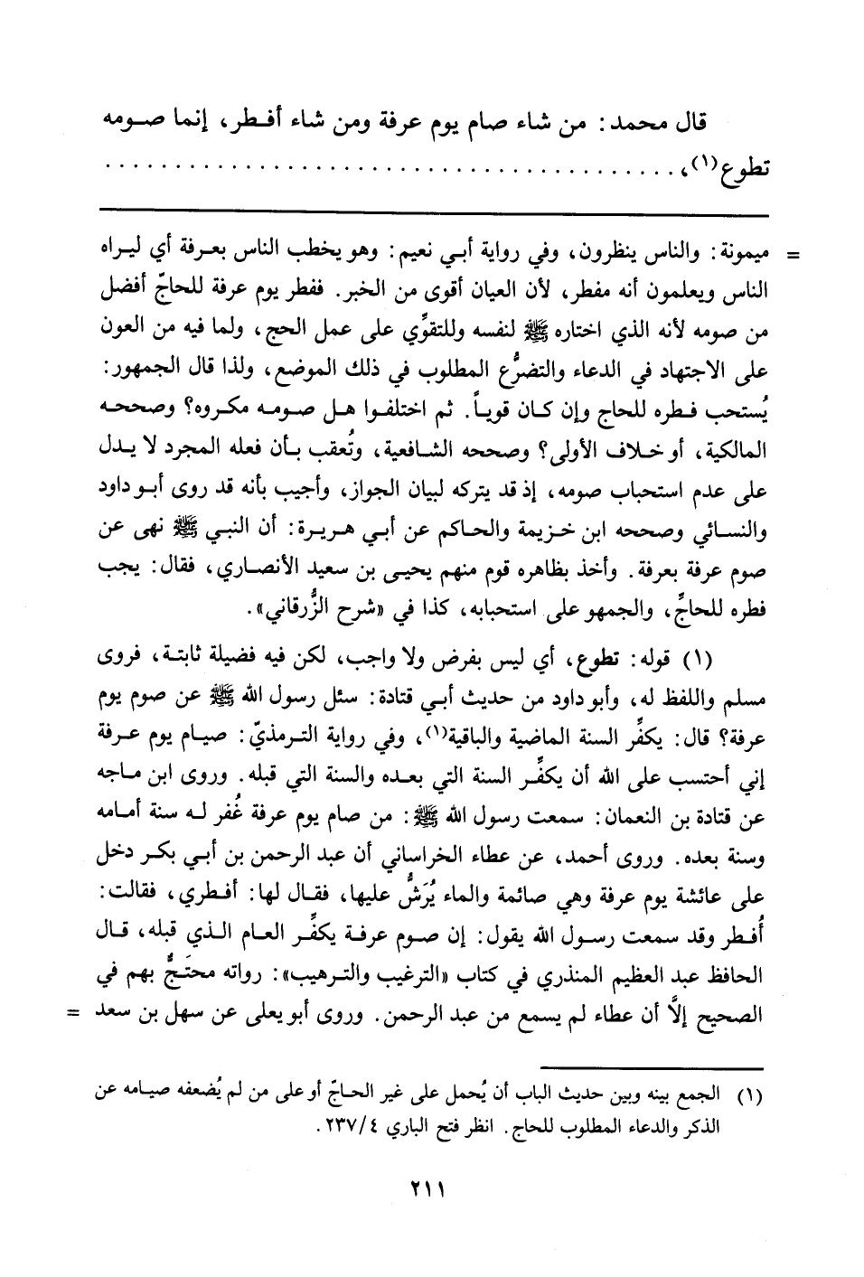 (¬1) قوله: تطوع، أي ليس بفرض ولا واجب، لكن فيه فضيلة ثابتة، فروى مسلم واللفظ له، وأبو داود من حديث أبي قتادة: سئل رسول الله صلّى الله عليه وسلّم عن صوم يوم عرفة؟ قال: يكفِّر السنة الماضية والباقية (الجمع بينه وبين حديث الباب أن يُحمل على غير الحاجّ أو على من لم يُضعفه صيامه عن الذكر والدعاء المطلوب للحاج. انظر فتح الباري 4/237) ، وفي رواية الترمذيّ: صيام يوم عرفة إني أحتسب على الله أن يكفِّر السنة التي بعده والسنة التي قبله. وروى ابن ماجه عن قتادة بن النعمان: سمعت رسول الله صلّى الله عليه وسلّم: من صام يوم عرفة غُفر له سنة أمامه وسنة بعده. وروى أحمد، عن عطاء الخرساني أن عبد الرحمن بن أبي بكر دخل على عائشة يوم عرفة وهي صائمة والماء يُرَشُّ عليها، فقال لها: أفطري، فقالت: أُفطر وقد سمعت رسول الله يقول: إن صوم عرفة يكفِّر العام الذي قبله، قال الحافظ عبد العظيم المنذري في كتاب "الترغيب والترهيب": رواته محتَجٌّ بهم في الصحيح إلاَّ عطاء لم يسمع من عبد الرحمن. وروى أبو يعلى عن سهل بن سعد