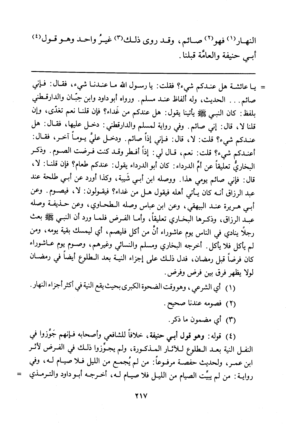 ورواه أبو داود وابن حبَّان والدارقطني بلفظ: كان النبي صلّى الله عليه وسلّم يأتينا يقول: هل عندكم من غَداء؟ فإن قلنا نعم تغدّى، وإن قلنا لا، قال: إني صائم. وفي رواية لمسلم والدارقطني: دخل عليها، فقال: هل عندكم شيء؟ قلت: لا، قال: فإني إذاً صائم. ودخل عليَّ يوماً آخر، فقال: أعندكم شيء؟ قلت: نعم، قال لي: إذاً أفطر وقد كنت فرضت الصوم.