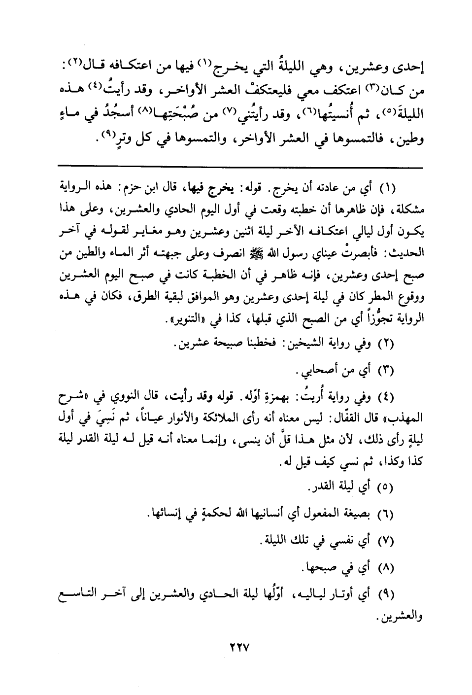 إِحْدَى وَعِشْرِينَ، وَهُيَ الليلةُ الَّتِي يَخْرُجُ (¬1) فِيهَا مِنَ اعْتِكَافِهِ قَالَ (¬2) : مَنْ كَانَ (¬3) اعْتَكَفَ مَعِيَ فليعتكفْ الْعَشْرَ الأَوَاخِرَ، وَقَدْ رأيتُ (¬4) هَذِهِ الليلةَ (¬5) ، ثُمَّ أُنسيتُها (¬6) ، وَقَدْ رأيتُني (¬7) مِنْ صُبْحَتِها (¬8) أسجُدُ فِي ماءٍ وَطِينٍ، فَالْتَمِسُوهَا فِي الْعَشْرِ الأَوَاخِرِ، والتمسوها في كل وترٍ (¬9) .