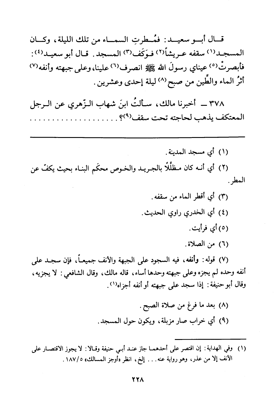 قَالَ أَبُو سَعِيدٍ: فمُطرتِ السَّمَاءُ مِنْ تِلْكَ اللَّيْلَةِ، وَكَانَ الْمَسْجِدُ (¬1) سَقْفُهُ عَرِيشًا (¬2) فوَكَف (¬3) الْمَسْجِدُ. قَالَ أَبُو سَعِيدٍ (¬4) : فأبصرتْ (¬5) عَيْنَايَ رسولَ اللَّهِ صَلَّى اللَّهُ عَلَيْهِ وَسَلَّمَ انْصَرَفَ (¬6) عَلَيْنَا، وَعَلَى جَبْهَتِهِ وَأَنْفِهِ (¬7) أثرُ الْمَاءِ والطِّين مِنْ صُبْحِ (¬8) لَيْلَةِ إِحْدَى وَعِشْرِينَ.
