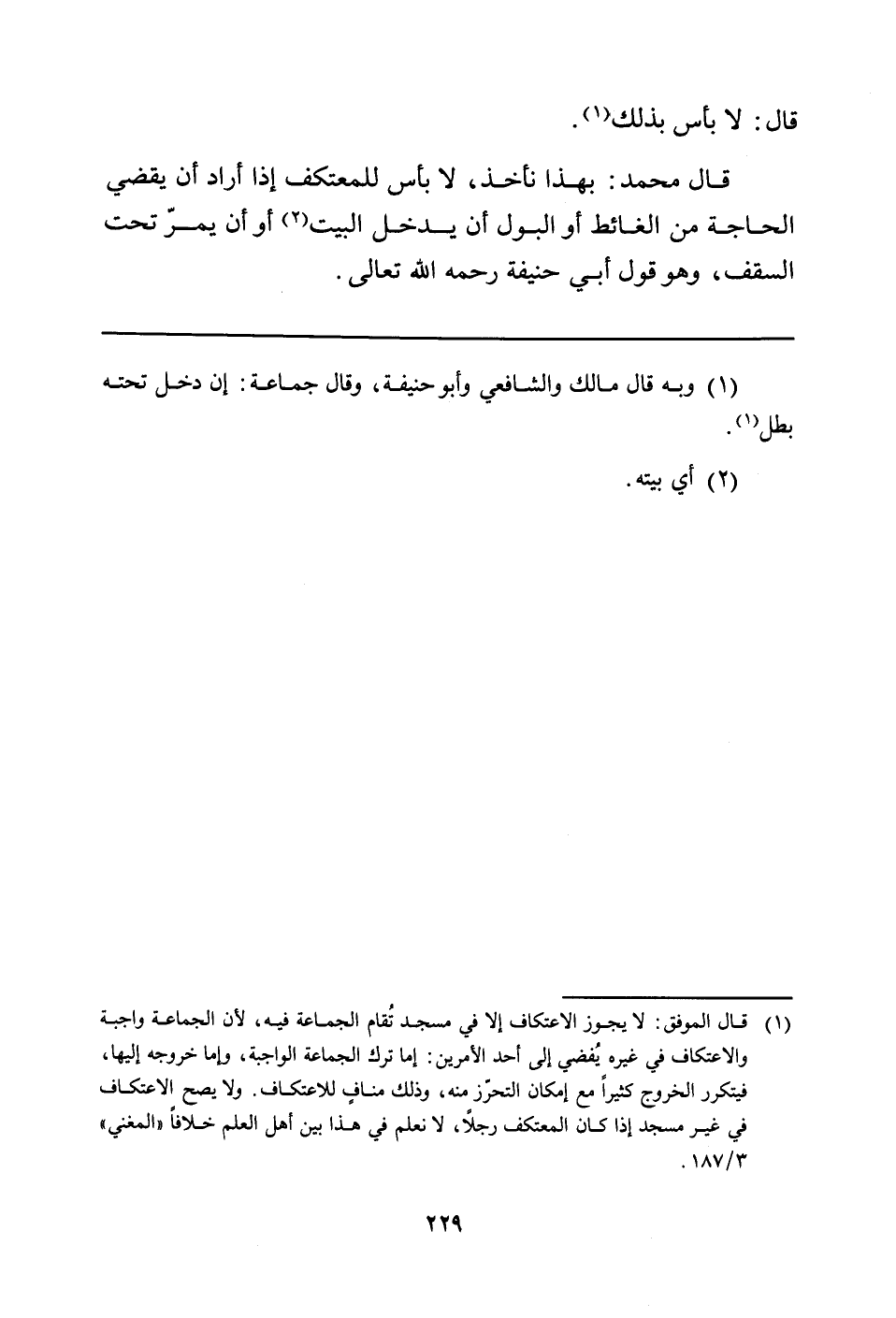 قَالَ مُحَمَّدٌ: بِهَذَا نَأْخُذُ، لا بَأْسَ لِلْمُعْتَكِفِ إِذَا أَرَادَ أَنْ يَقْضِيَ الْحَاجَةَ مِنَ الْغَائِطِ أَوِ الْبَوْلِ أَنْ يَدْخُلَ الْبَيْتَ (¬2) أَوْ أَنْ يَمُرَّ تَحْتَ السَّقْفِ، وَهُوَ قَوْلُ أَبِي حَنِيفَةَ رَحِمَهُ اللَّهُ تَعَالَى.
