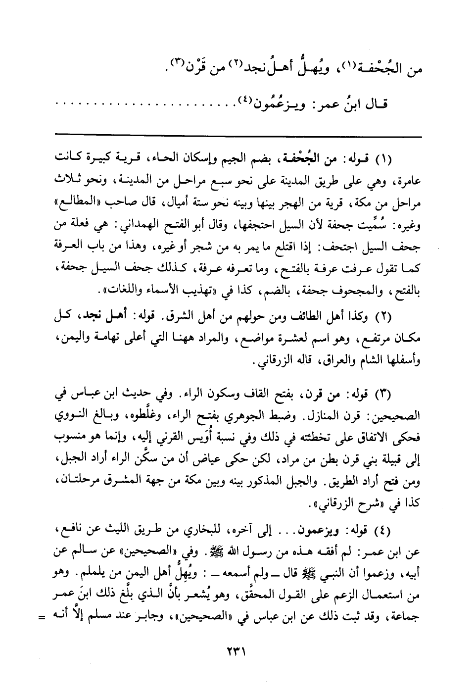 (¬3) قوله: من قرن، بفتح القاف وسكون الراء. وفي حديث ابن عباس في الصحيحين: قرن المنازل. وضبط الجوهري بفتح الراء، وغلَّطوه، وبالغ النووي فحكى الاتفاق على تخطئته في ذلك وفي نسبة أُوَيس القرني إليه، وإنما هو منسوب إلى قبيلة بني قرن بطن من مراد، لكن حكى عياض أن من سكَّن الراء أراد الجبل، ومن فتح أراد الطريق. والجبل المذكور بينه وبين مكة من جهة المشرق مرحلتان، كذا في "شرح الزُّرقاني".