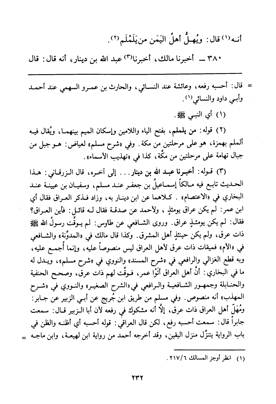 (¬3) قوله: أخبرنا عبد الله بن دينار ... إلى آخره، قال الزرقاني: هذا الحديث تابع فيه مالكاً إسماعيلُ بن جعفر عند مسلم، وسفيان بن عيينة عند البخاري في "الاعتصام". كلاهما عن ابن دينار به، وزاد فذكر العراق فقال أي ابن عمر: لم يكن عراق يومئذٍ، ولأحمد عن صدقة فقال له قائل: فأين العراق؟ فقال: لم يكن يومئذ عراق. وروى الشافعي عن طاوس لم يوقت رسول الله صلى الله عليه وسلم ذات عرق ولم يكن حينئذٍ أهل المشرق. وكذا قال مالك في "المدوَّنة" والشافعي في "الأم" فميقات ذات عرق لأهل العراق ليس منصوصاً عليه، وإنما أُجمع عليه، وبه قطع الغزالي والرافعي في "شرح المسند" والنووي في "شرح مسلم"، ويدل له ما في البخاري: أنَّ أهل العراق أتَوْا عمر، فوقَّت لهم ذات عرق، وصحح الحنفية والحنابلة وجمهور الشافعية والرافعي في "الشرح الصغير" والنووي في "شرح المهذب" أنه منصوص. وفي مسلم من طريق ابن جُريج عن أبي الزبير عن جابر: ومُهَلّ أهل العراق ذات عرق، إلاّ أنه مشكوك في رفعه لأن أبا الزبير قال: سمعت جابراً قال: سمعت أحسبه رفع، لكن قال العراقي: قوله أحسبه أي أظنه والظن في باب الرواية يتنزَّل منزل اليقين، وقد أخرجه أحمد من رواية ابن لهيعة، وابن ماجه