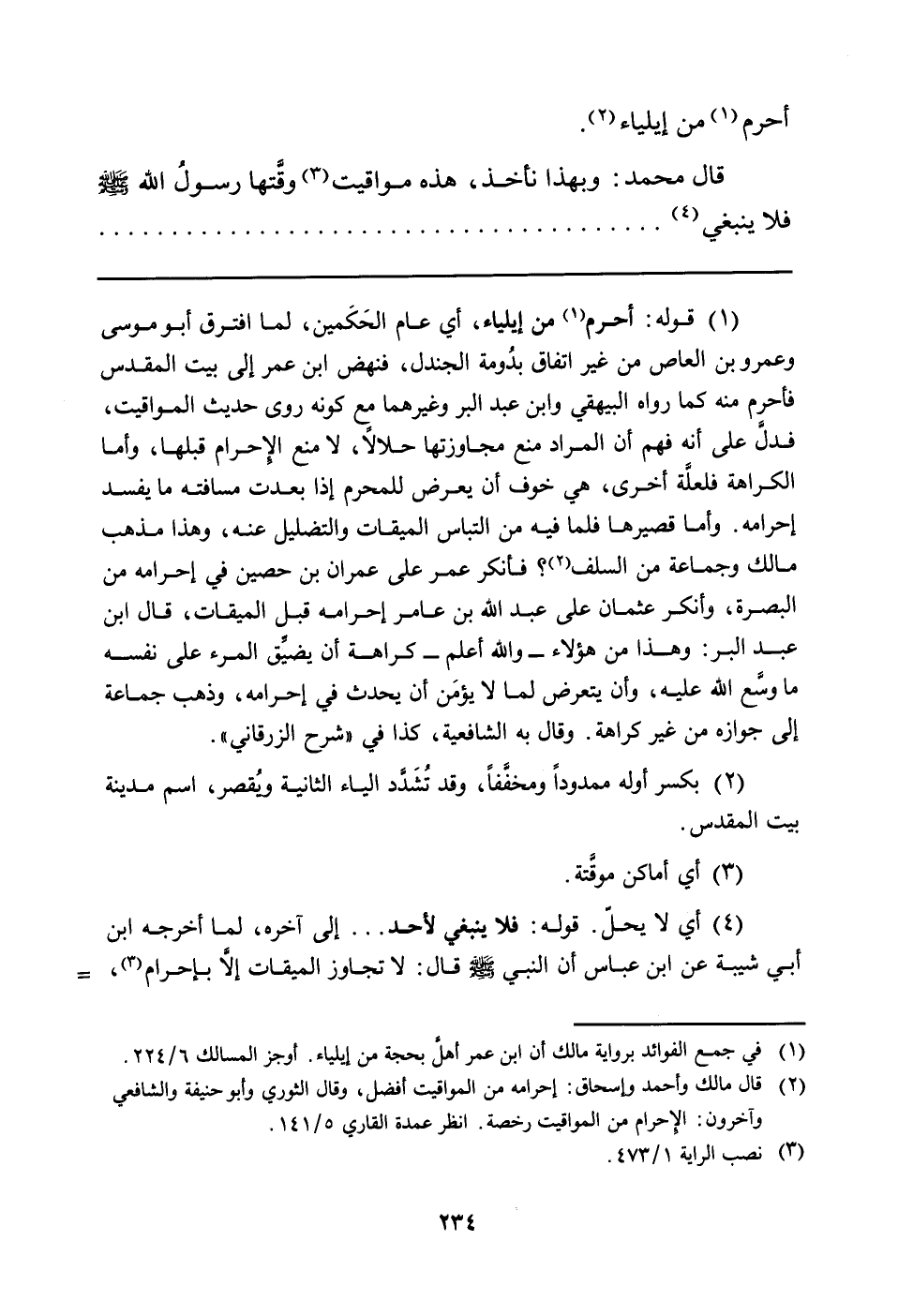 (¬4) أي لا يحلّ. قوله: فلا ينبغي لأحد ... إلى آخره، لما أخرجه ابن أبي شيبة عن ابن عباس أن النبي صلّى الله عليه وسلّم قال: لا تجاوز الميقات إلاَّ بإحرام
