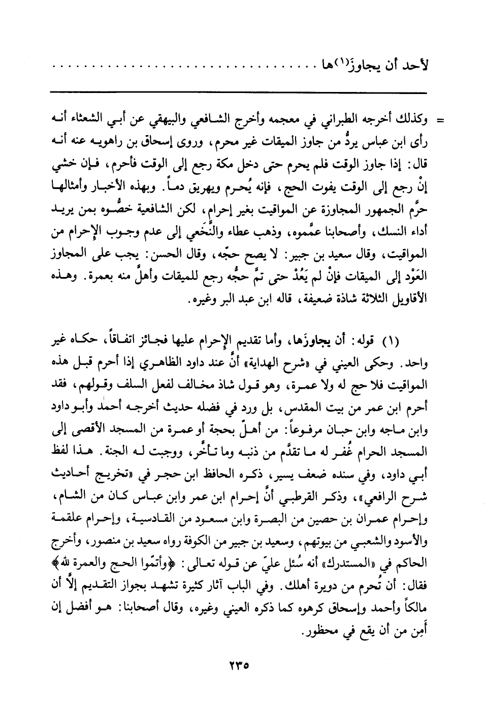 (نصب الراية 1/473) ، وكذلك أخرجه الطبراني في معجمه وأخرج الشافعي والبيهقي عن أبي الشعثاء أنه رأى ابن عباس يردُّ من جاوز الميقات غير محرم، وروى إسحاق بن راهويه عنه أنه قال: إذا جاوز الوقت فلم يحرم حتى دخل مكة رجع إلى الوقت فأحرم، فإن خشي إنْ رجع إلى الوقت يفوت الحج، فإنه يُحرم ويهريق دماً. وبهذه الأخبار وأمثالها حرَّم الجمهور المجاوزة عن المواقيت بغير إحرام، لكن الشافعية خصُّوه بمن يريد أداء النسك، وأصحابنا عمَّموه، وذهب عطاء والنَّخَعي إلى عدم وجوب الإِحرام من المواقيت، وقال سعيد بن جبير: لا يصح حجّه، وقال الحسن: يجب على المجاوز العَوْد إلى الميقات فإنْ لم يَعُدْ حتى تمَّ حجُّه رجع للميقات وأهلَّ منه بعمرة. وهذه الأقاويل الثلاثة شاذة ضعيفة، قاله ابن عبد البر وغيره.