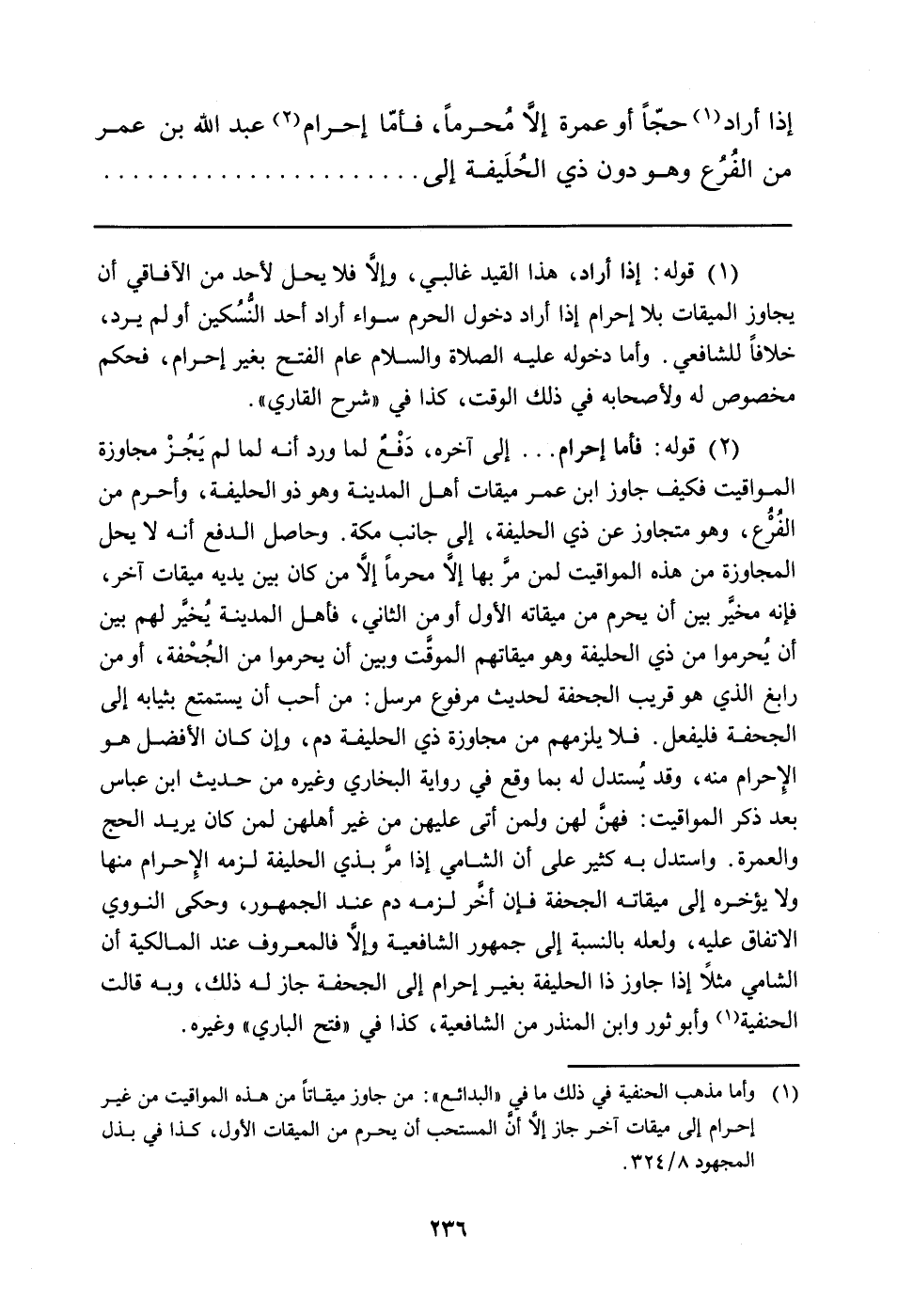 إِذَا أَرَادَ (¬1) حَجًّا إلاَّ مُحرماً، فَأَمَّا إِحْرَامُ (¬2) عَبْدِ اللَّهِ بْنِ عُمَرَ مِنَ الفُرُع وَهُوَ دون ذي الحُلَيفة إلى