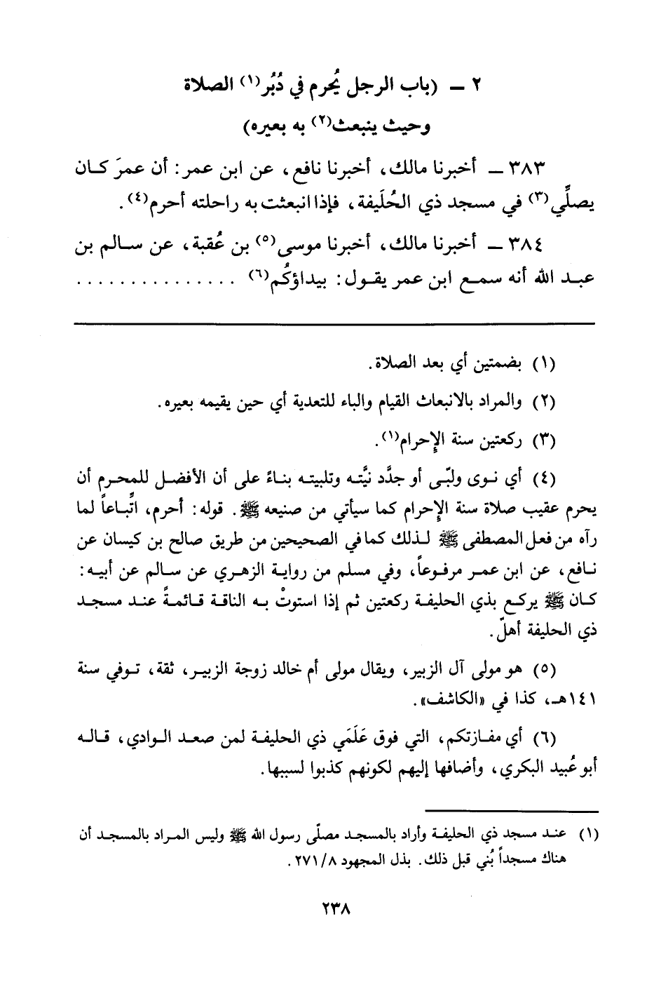 383 - أَخْبَرَنَا مَالِكٌ، أَخْبَرَنَا نَافِعٌ، عَنِ ابْنِ عُمَرَ: أَنَّ عمرَ كَانَ يصلِّي (¬3) فِي مَسْجِدِ ذِي الحُلَيفة، فَإِذَا انْبَعَثَتْ بِهِ رَاحِلَتُهُ أَحْرَمَ (¬4) .
