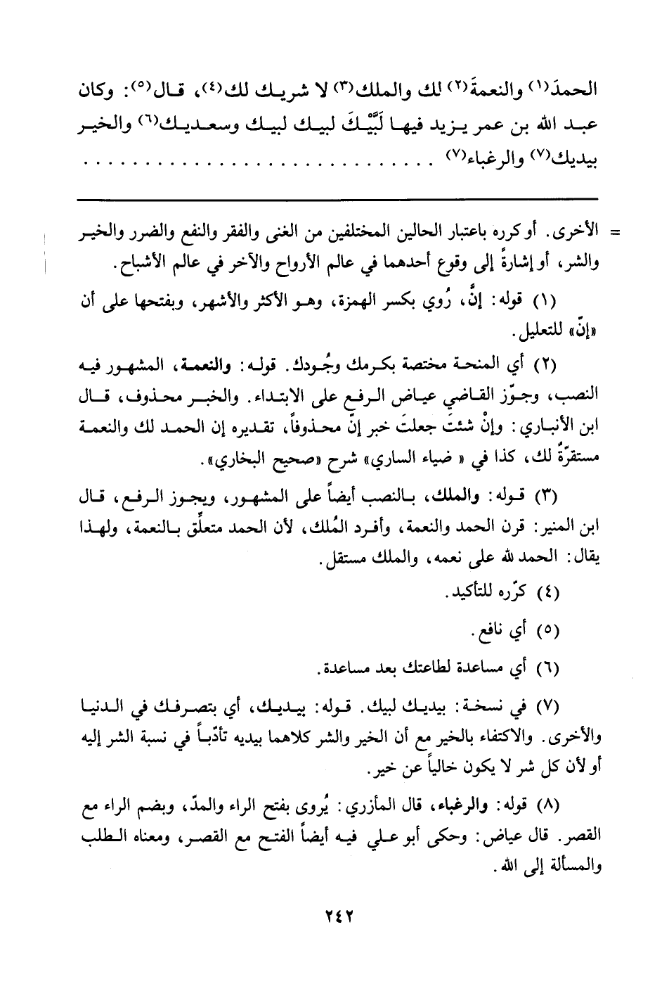 الحمدَ (¬1) وَالنِّعْمَةَ (¬2) لَكَ وَالْمُلْكَ (¬3) لا شَرِيكَ لَكَ (¬4) ، قَالَ (¬5) : وَكَانَ عَبْدُ اللَّهِ بْنُ عُمَرَ يَزِيدُ فِيهَا لَبَّيْكَ لَبَّيْكَ لَبَّيْكَ وَسَعْدَيْكَ (¬6) وَالْخَيْرُ بِيَدَيْكَ (¬7) والرغباء (¬8)
