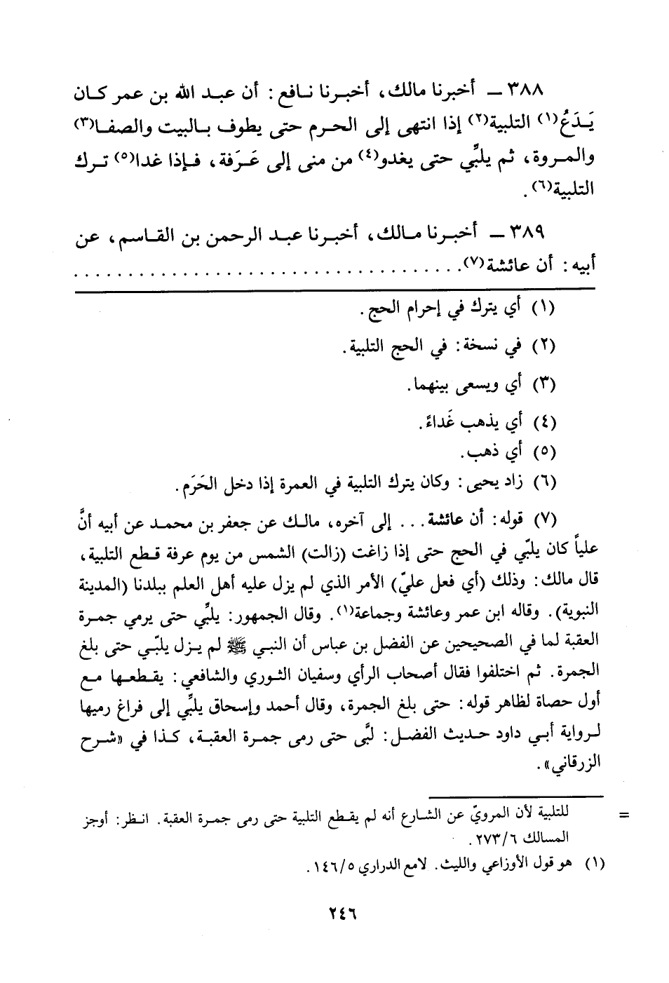 388 - أَخْبَرَنَا مَالِكٌ، أَخْبَرَنَا نَافِعٌ: أَنَّ عَبْدَ اللَّهِ بْنَ عُمَرَ كَانَ يَدَعُ (¬1) التَّلْبِيَةَ (¬2) إِذَا انْتَهَى إِلَى الْحَرَمِ حَتَّى يَطُوفَ بِالْبَيْتِ وَالصَّفَا (¬3) وَالْمَرْوَةَ، ثُمَّ يلبِّي حَتَّى يَغْدُوَ (¬4) مِنْ مِنًى إِلَى عَرَفة، فَإِذَا غَدَا (¬5) تَرَكَ التَّلْبِيَةَ (¬6) .