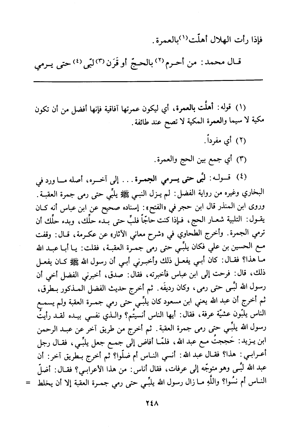 (¬4) قوله: لبَّى حتى يرمي الجمرة ... إلى آخره، أصله ما ورد في البخاري وغيره من رواية الفضل: لم يزل النبي صلّى الله عليه وسلّم يلبِّي حتى رمى جمرة العقبة.